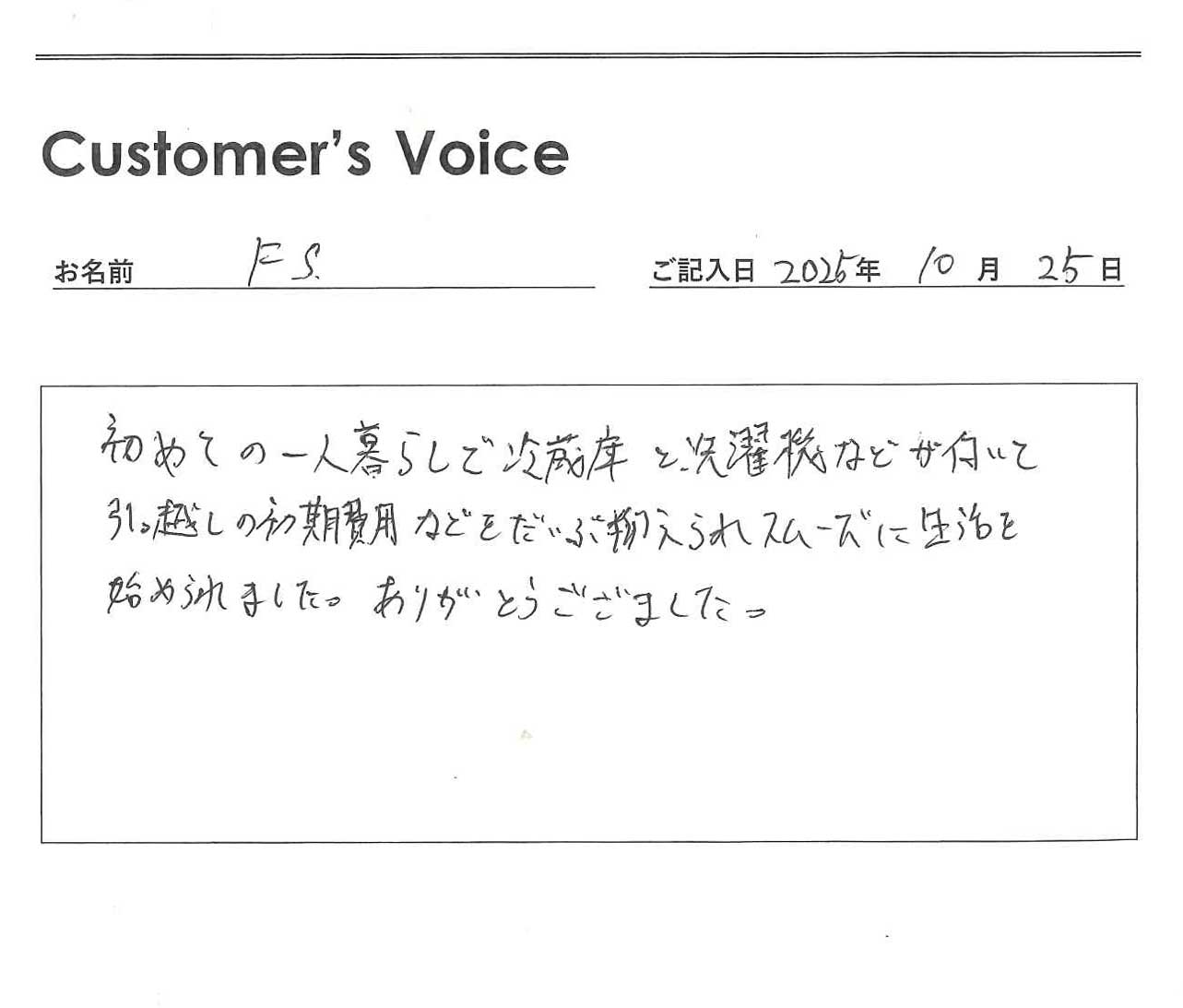 ◉冷蔵庫と洗濯機が設備なのは便利だし、入退室の時に本当にありがたさを感じるよね。オーナーさんのご厚意によるものなので、Fくんからのコメントを伝えさせてもらいます!(二代目より)