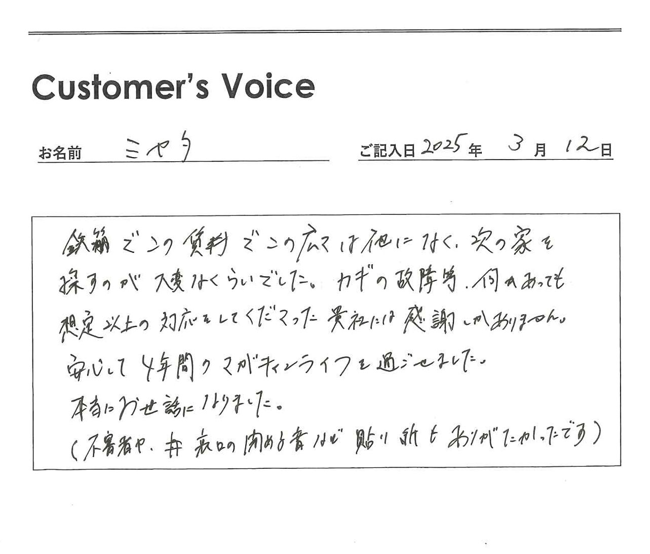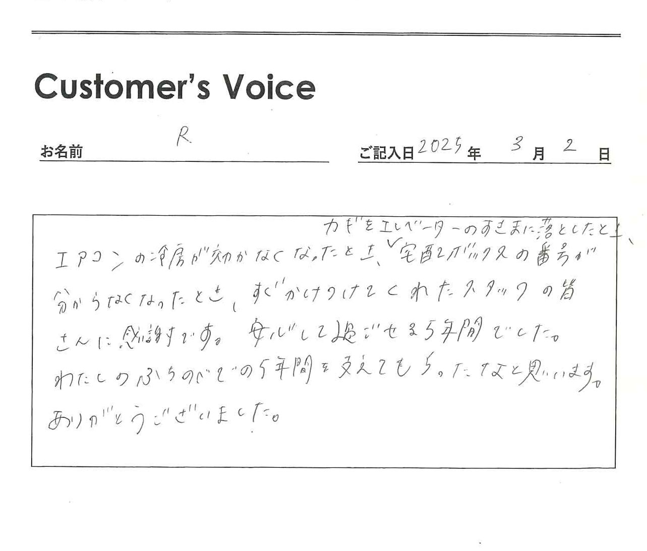 ◉Rさん、「契約してからが本当のお付き合いの始まり」です。入居者のみなさんに安心・安全な住空間を変わらずに提供し続けることを大事としているのでうれしいです!(二代目より)