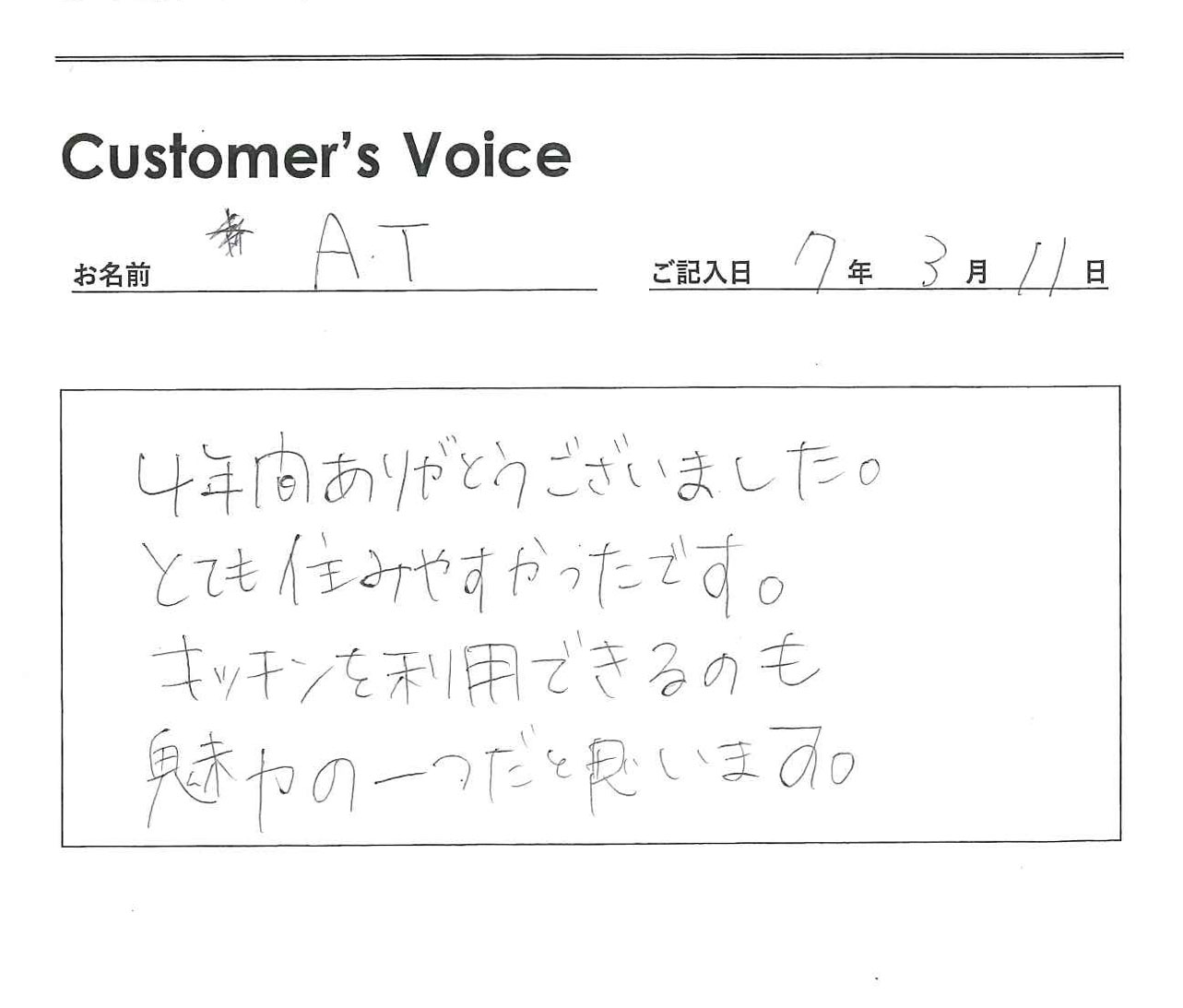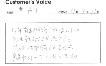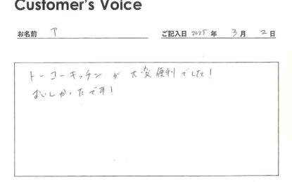 ◉Tさん、こちらこそ、4年間ご入居ありがとうございました。トーコーキッチンもご利用ありがとうございました。お勤めの方にそのように仰っていただけるとうれしいです!(二代目より)