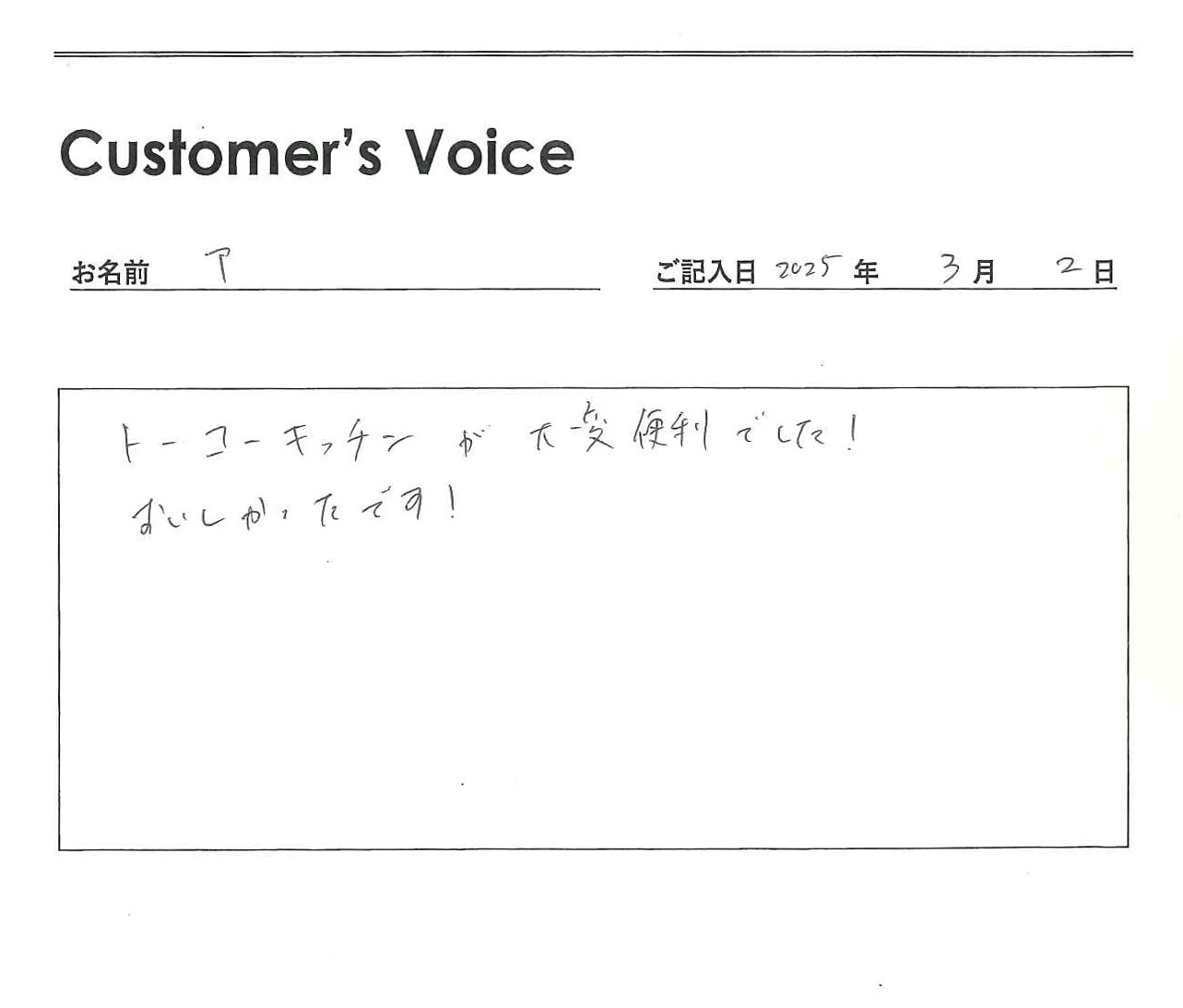 ◉Tくん、「便利」「おいしい」の言葉が聞けて、不動産屋冥利に尽きます。トーコーキッチンを始めて本当に良かったです。新生活になってもちゃんとごはんも食べてね!(二代目より)