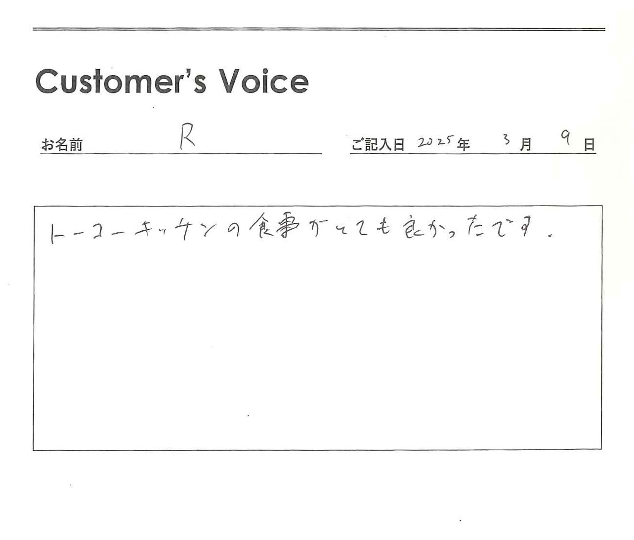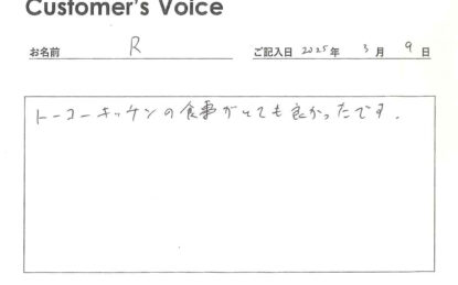 ◉Rくん、トーコーキッチンの食事がとても良かったと聞けて、こちらこそ、とても良かったです。不動産屋冥利に尽きます。新天地で始まる新たな生活も頑張ってね!(二代目より)