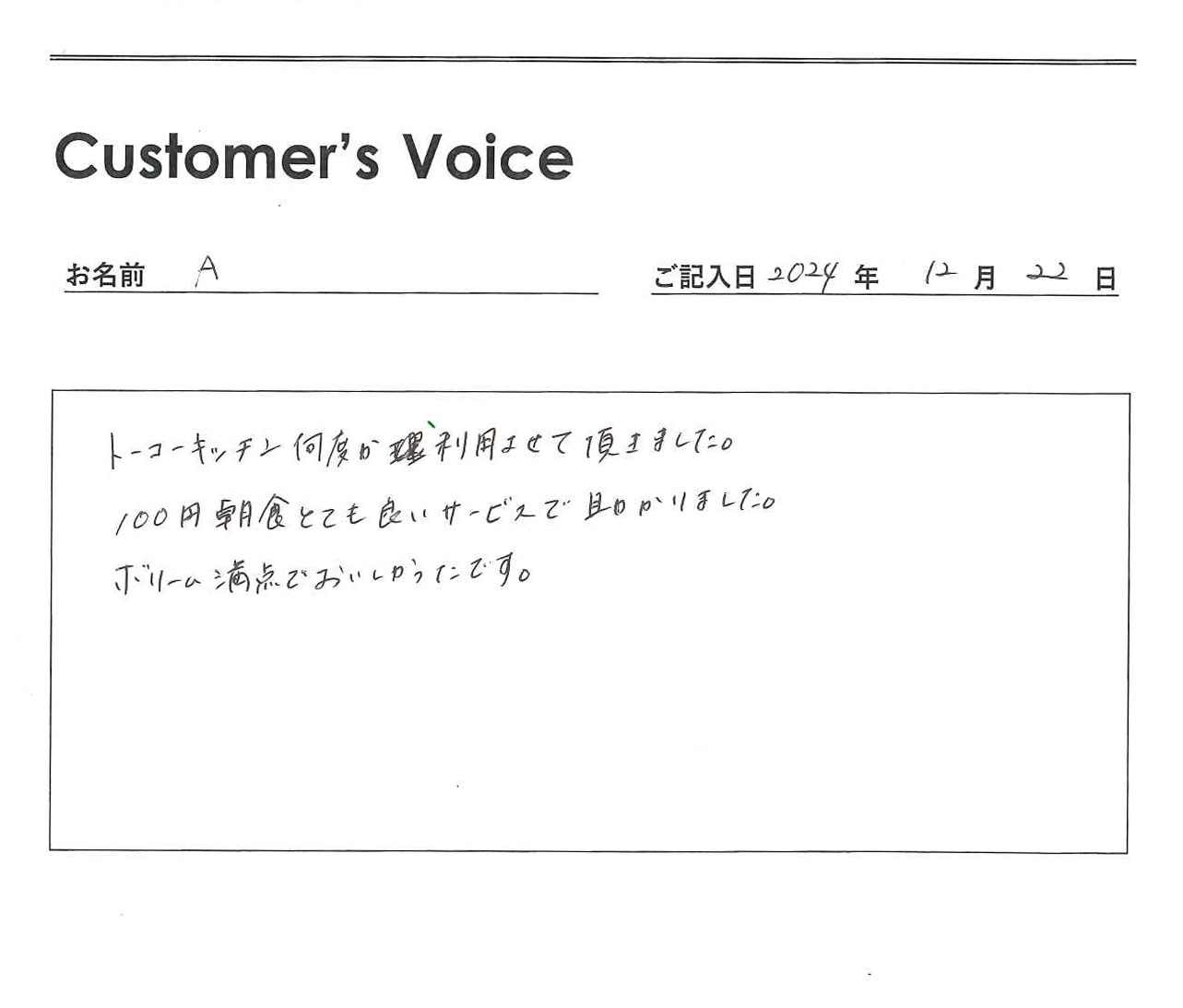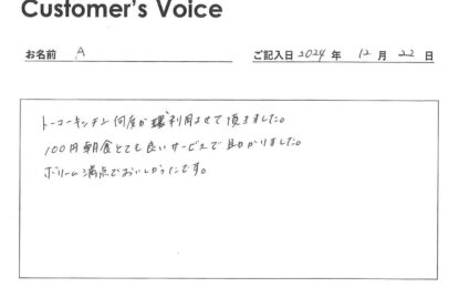 ◉Aさん、お仕事がお忙しいのにもかかわらず、トーコーキッチンをご利用いただきありがとうございました。良いサービスと仰っていただけて、とても励みになります!(二代目より)