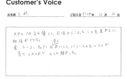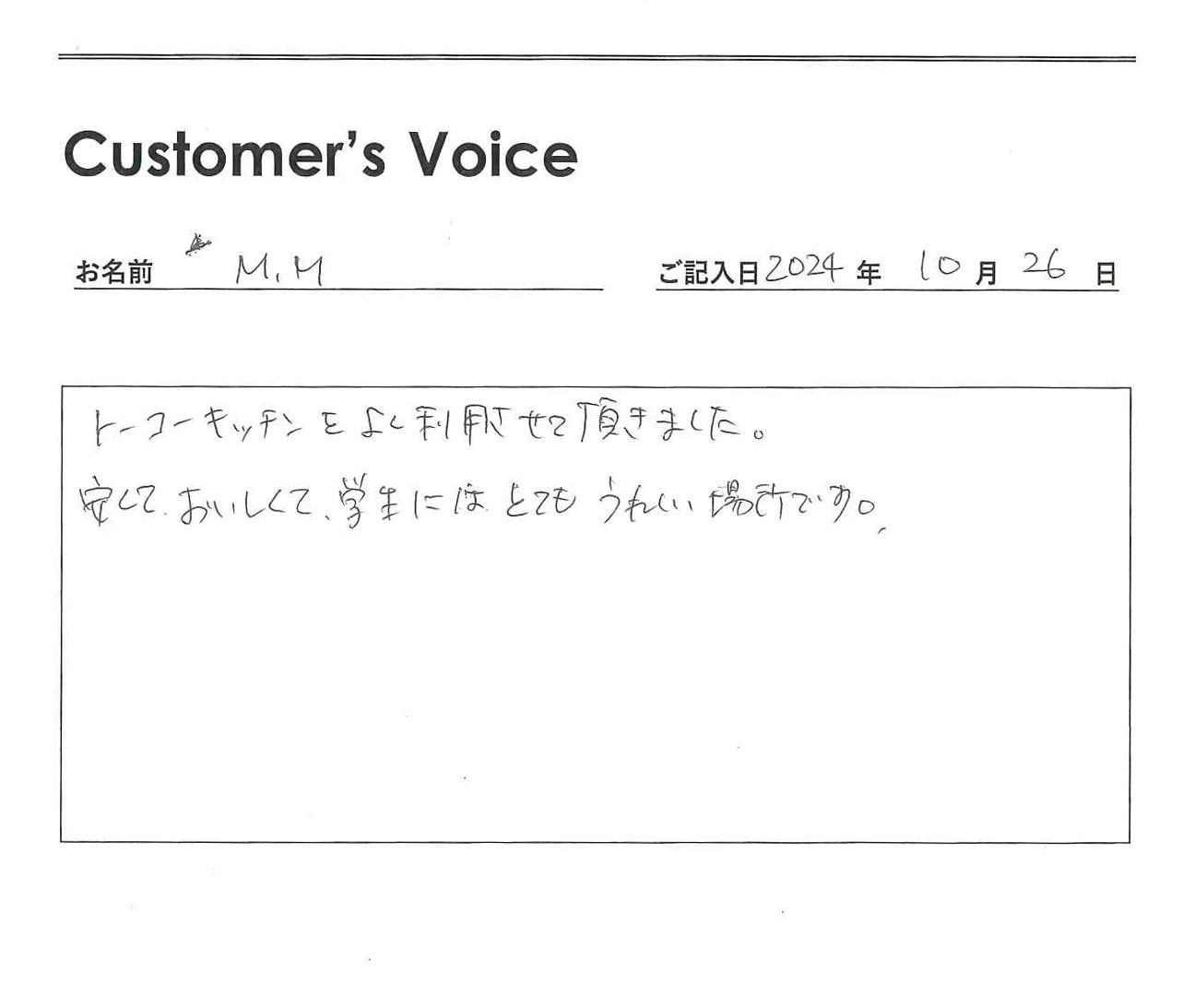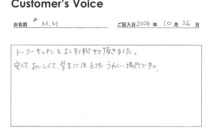 ◉Mさん、いつもトーコーキッチンを利用してくれてありがとうございました。「おいしい」と言われることが何よりうれしい不動産屋としては、不動産屋冥利に尽きます!(二代目より)