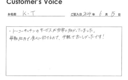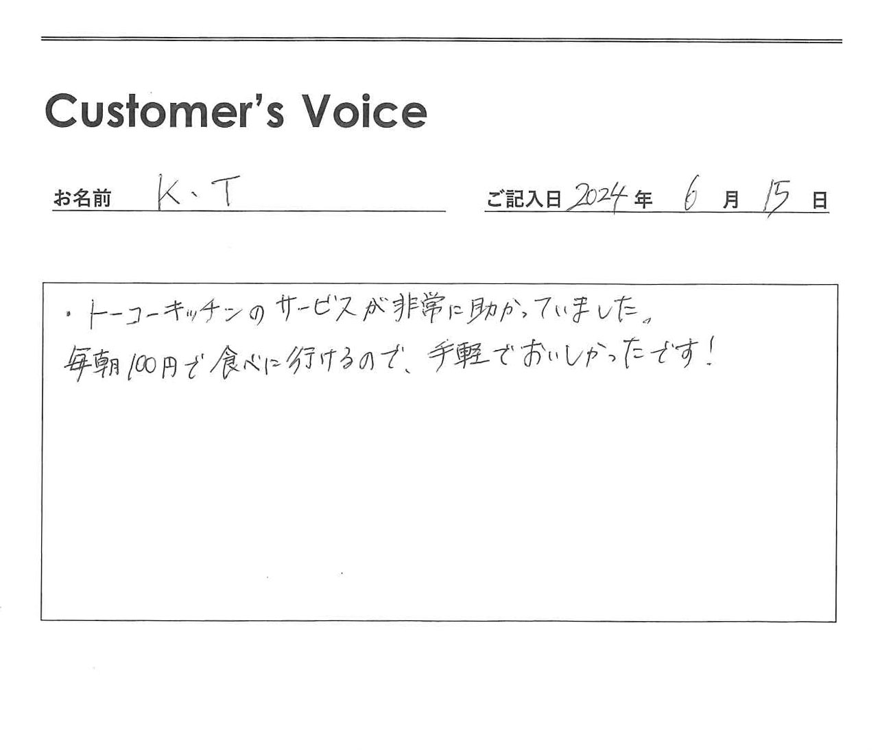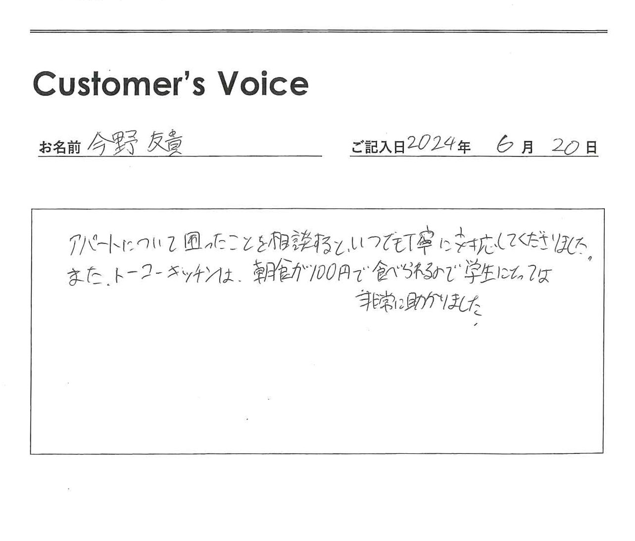 ◉今野くん、いつもトーコーキッチンを利用してくれてありがとう。有効活用してくれている様子を見て、とてもうれしく思っていました。新生活でも朝ごはん食べてね!(二代目より)