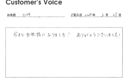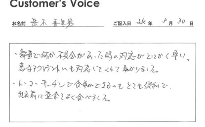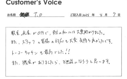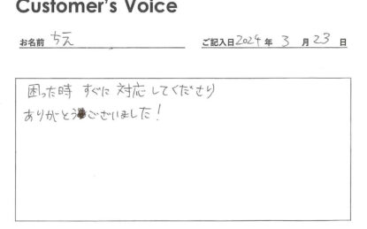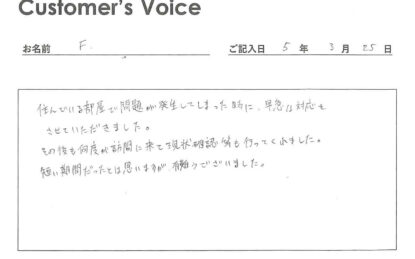 ◉思いもかけない問題が発生したのにも関わらず、ご理解・ご協力いただき誠にありがとうございました。Fさんの寛大なご対応のおかげで解決することができました!(二代目より)