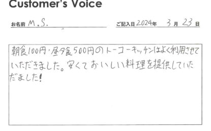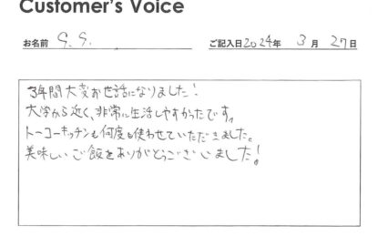 ◉いつもトーコーキッチンを活用してくれていて本当にうれしかったです。こちらこそ、3年間ご入居ありがとう。そして、卒業おめでとう。新しい生活も頑張ってね!(二代目より)