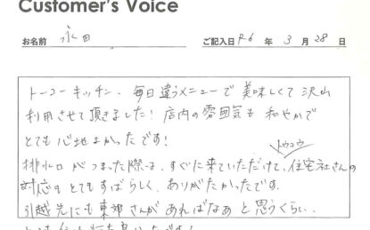 ◉トーコーキッチンを存分に堪能してくれてありがとう。引越先に東郊住宅社がなくて申し訳ないけれども、またこちら方面に住むことになった際にはお待ちしてます!(二代目より)