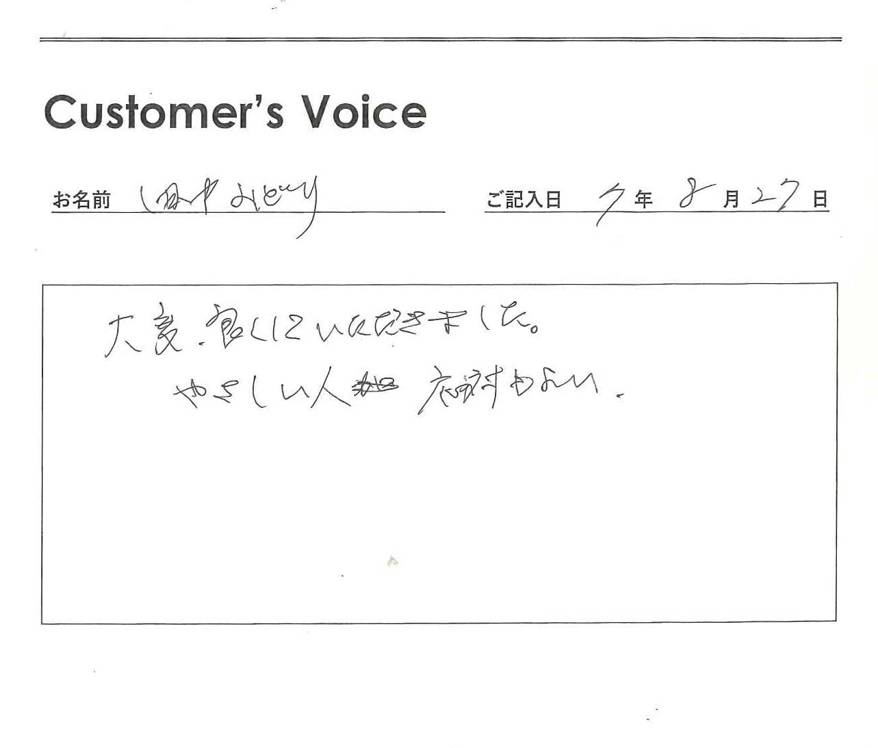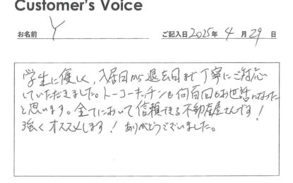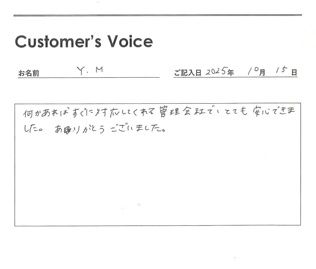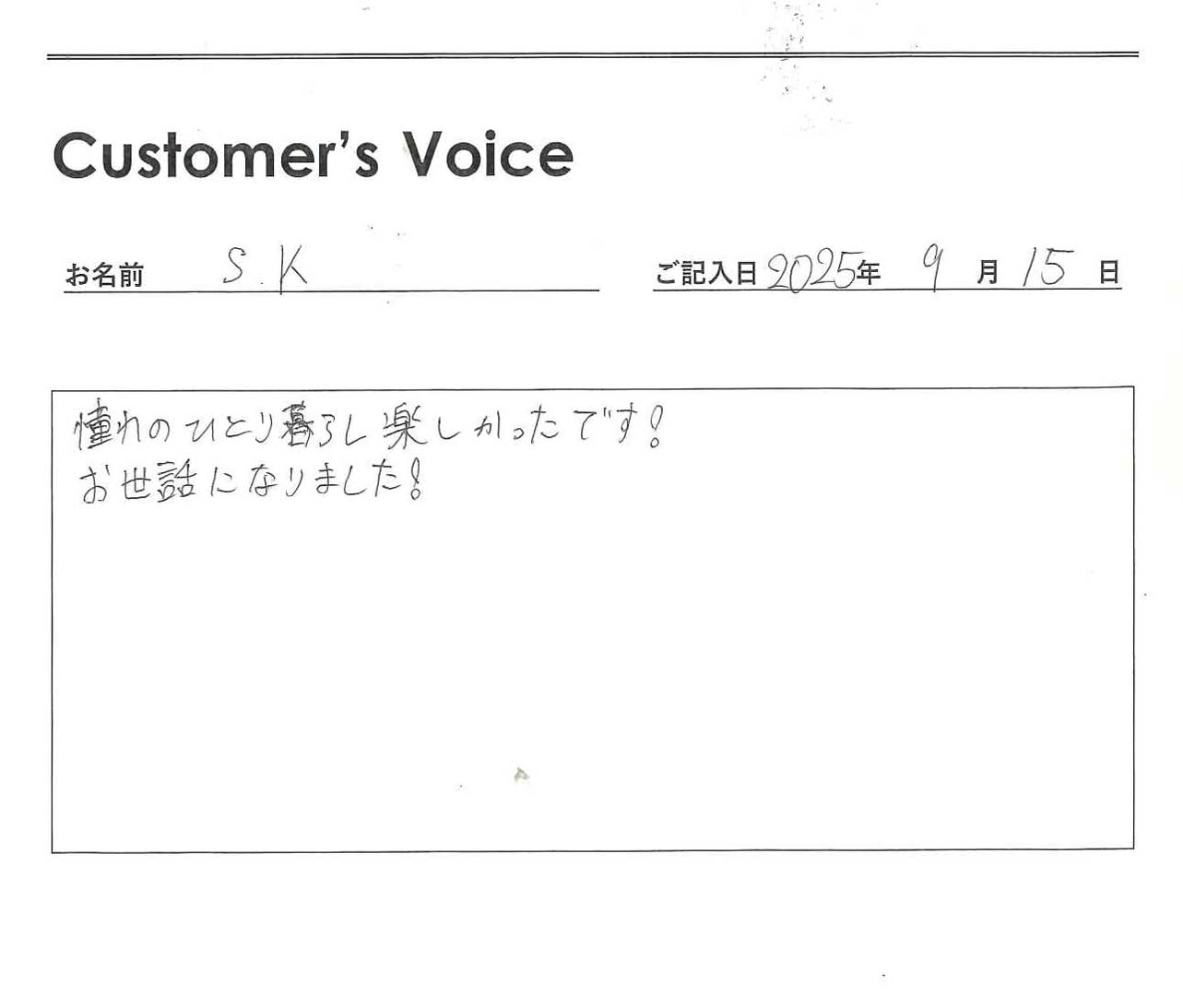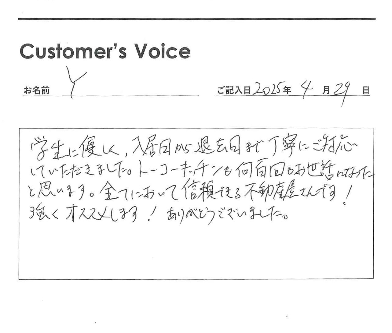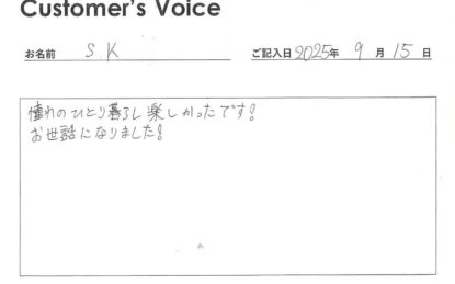 ◉Mさん、この度は店舗でのご入居を誠にありがとうございました。いただいたコメントはスタッフで共有し、励みにさせていただきます。またのご縁をお待ちしております!(二代目より)