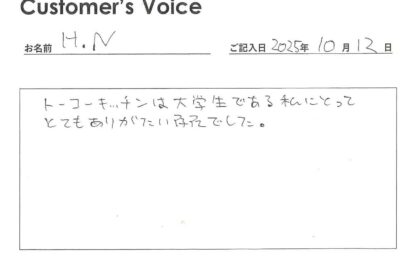 ◉こちらこそ、ご入居ありがとうございました。トーコーキッチンもいつもご利用ありがとうございました。憧れの一人暮らしがより楽しくなる一助になれてたらうれしいです!(二代目より)