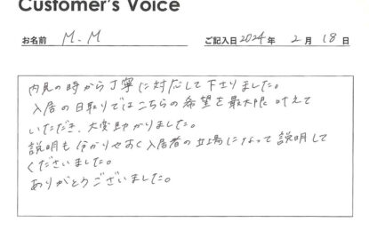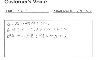 ◉Mさん、この度は当社管理物件ご入居ありがとうございました。これからも、入居者のみなさんに安心・安全な住空間を変わらずに提供し続けることを大事としてまいります!(二代目より)