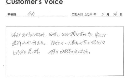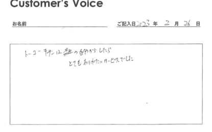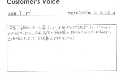 ◉Hくん、卒業おめでとう。うれしい言葉をありがとう。暮らしやすかったと聞いて、安心しました。Hくんの言葉はオーナーさんにも伝えさせてもらうね。新生活も頑張ってね!(二代目より)