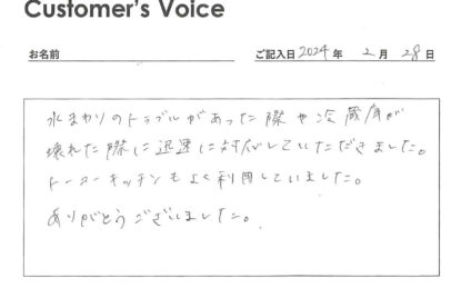 ◉設備の不具合やトラブルの際の寛大なご理解・ご協力に、こちらこそ心から感謝です。本当にありがとうございました。トーコーキッチンも便利に利用してくれてありがとう!(二代目より)