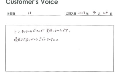 ◉Hさん、トーコーキッチンのごはんがお口に合ってよかったです。「おいしかった」と言われるのが本当にうれしいので、これからもメニュー開発に全力で取り組んでいきます!(二代目より)