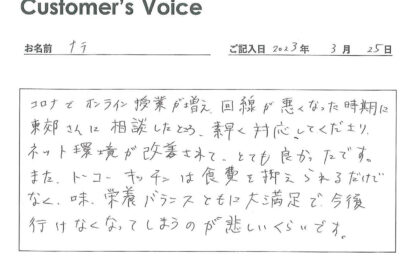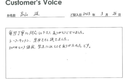 ◉こちらこそ、6年間ありがとうございました。勉強をよく頑張ったね。そんな忙しい学校生活の中でトーコーキッチンを有効活用してもらえていたのは本当にうれしいです!(二代目より)
