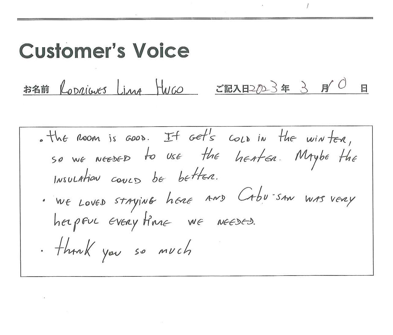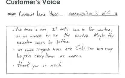 ◉Hugoさん、こちらこそ、次の入居者を紹介してくれてどうもありがとう。日本での生活を楽しんでもらえてうれしいです。お別れはとても寂しいけど、See you again!(二代目より)