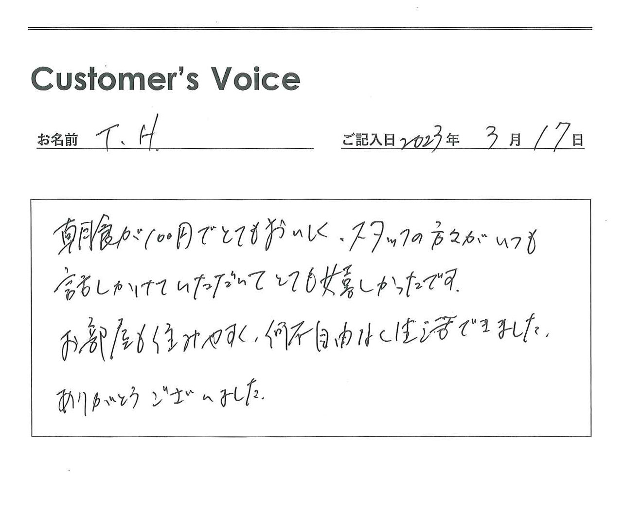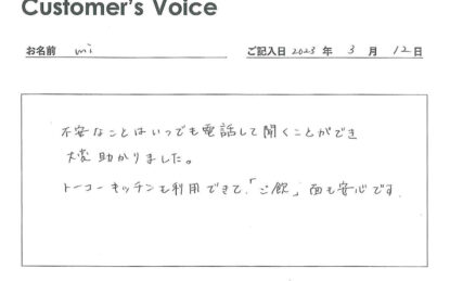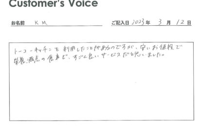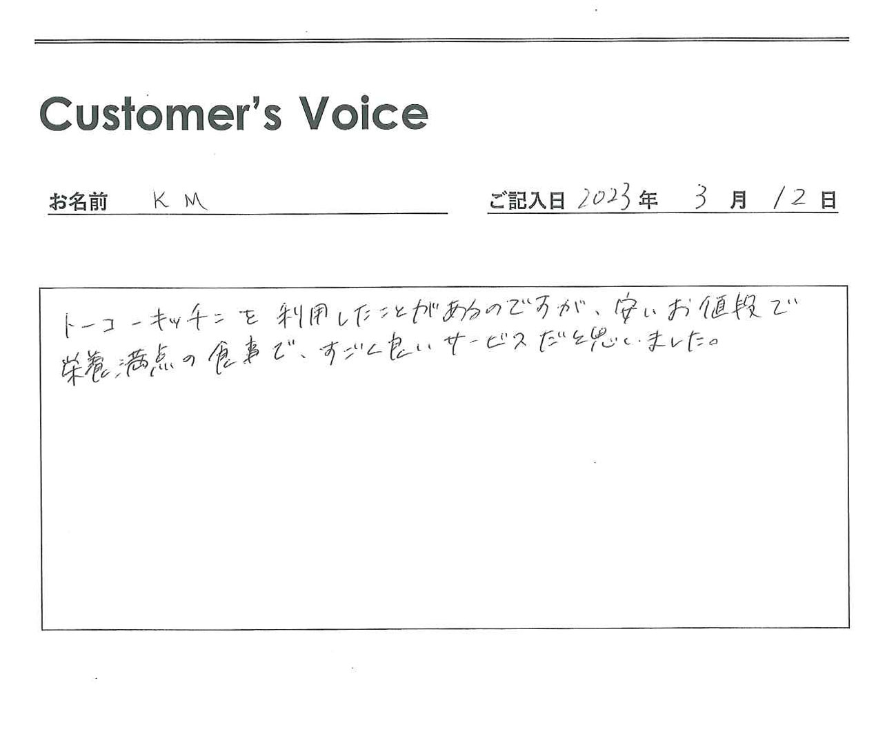 ◉Mさん、トーコーキッチンのサービスを気に入ってくれてありがとう。スタッフ一同、励みになります。新生活が始まっても栄養満点の食事を摂って、元気に頑張ってね!(二代目より)