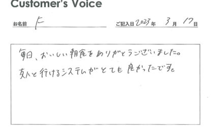 ◉Fくん、こちらこそトーコーキッチンのサービスの特性を存分に活用してくれてありがとう。トーコーキッチンを始めてよかったです。新生活でも毎日しっかり朝食を食べてね!(二代目より)