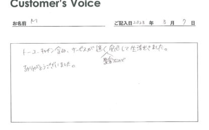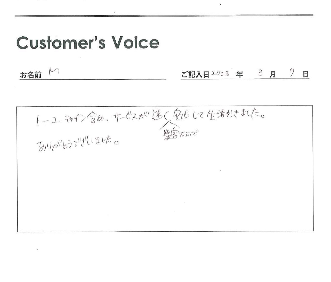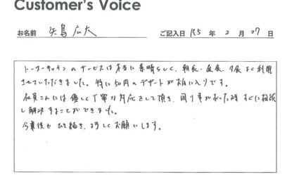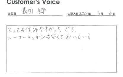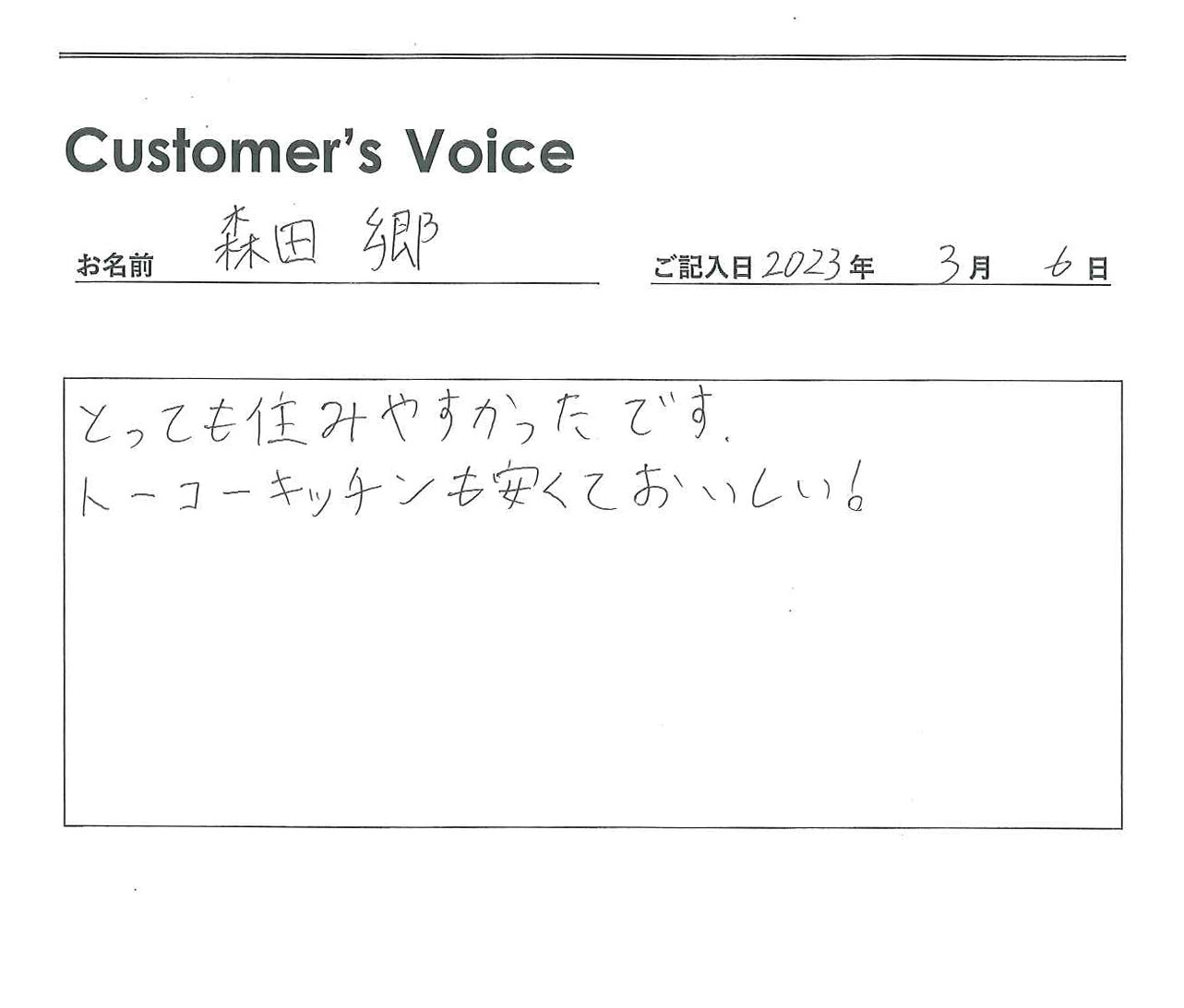 ◉とっても住みやすかったとのこと。オーナーさんが喜ぶので、森田くんのメッセージをさっそく伝えさせてもらうね。トーコーキッチンも気に入ってもらえてよかった!(二代目より)