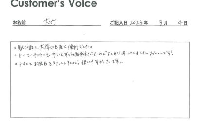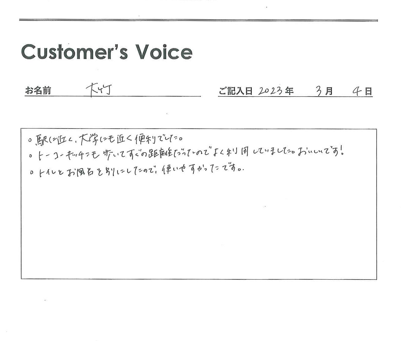 ◉駅にも大学にもトーコーキッチンにも近いのは、やっぱり便利だよね。「おいしい」だなんて、不動産屋冥利に尽きる言葉をありがとう。新生活でもちゃんと食事してね!(二代目より)