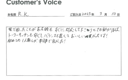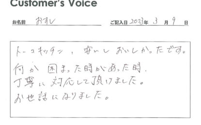 ◉おすしさん、トーコーキッチンを有効活用してくれてありがとう。また、こちらこそ、迷惑や不便をかけてしまったのにも関わらず、寛大に対応してくれて助かりました!(二代目より)