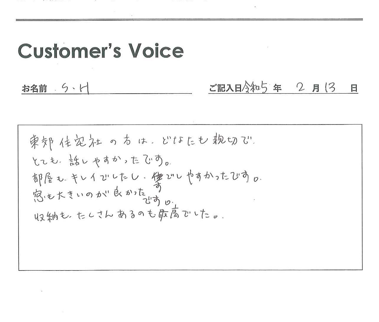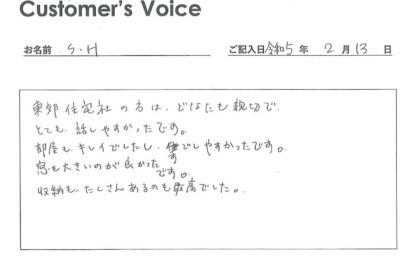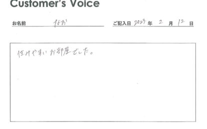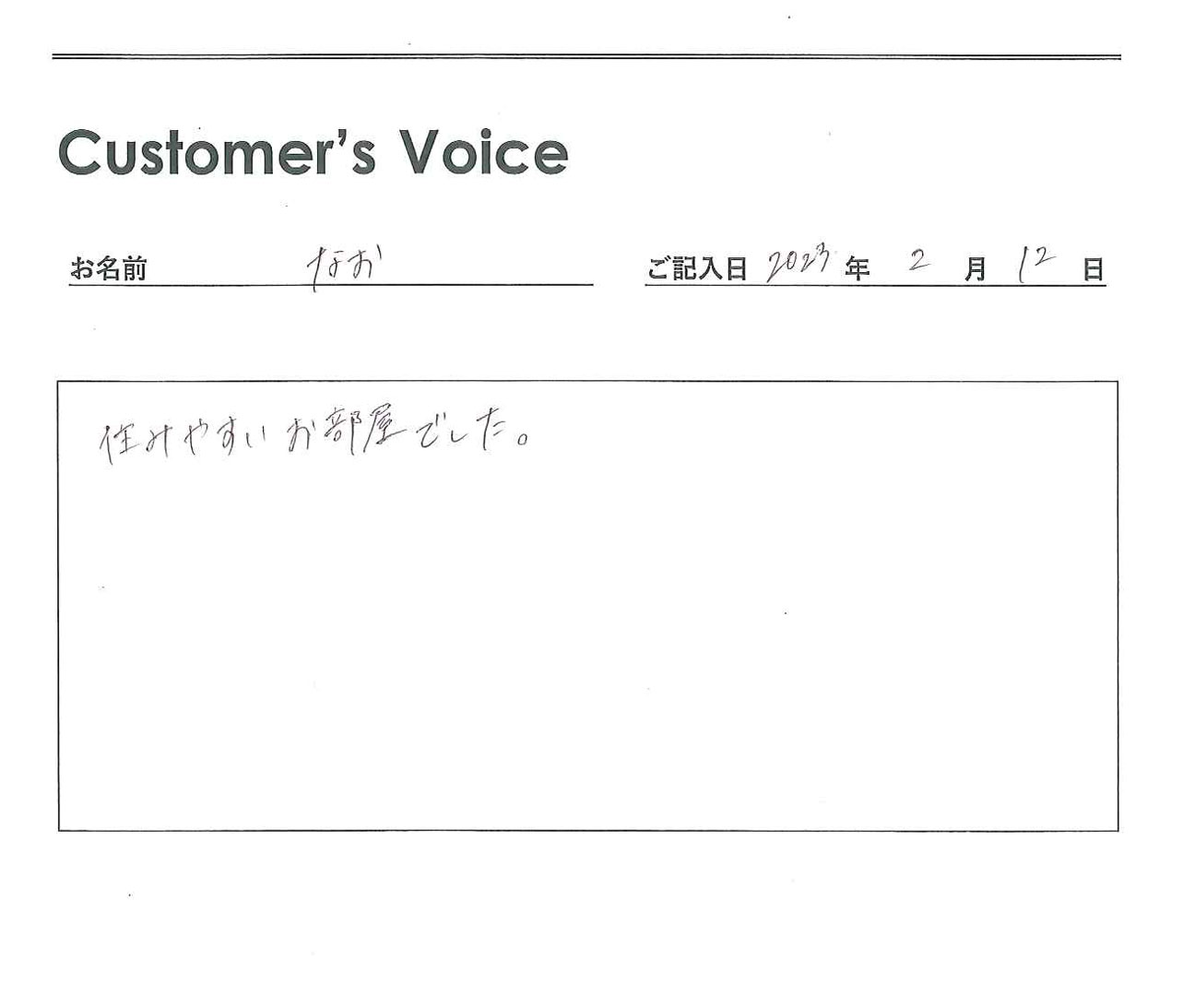◉この度はご縁をありがとうございました。退室時にSさんのようなコメントをもらえることは、不動産屋冥利に尽きます。これからもスタッフ一同、丁寧な仕事を心掛けます!(二代目より)