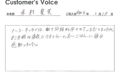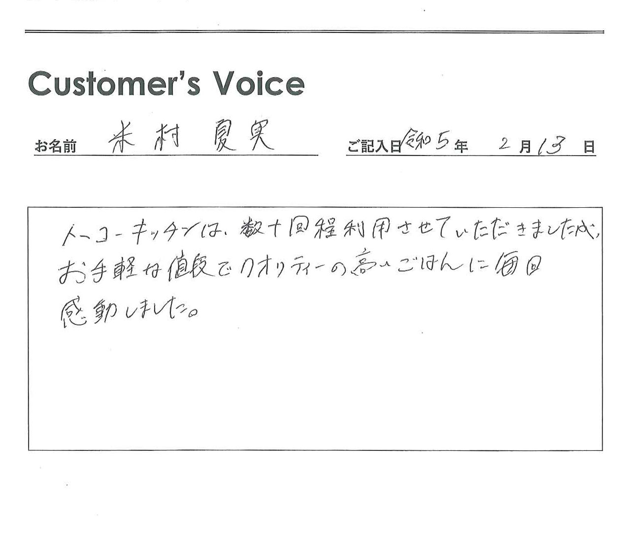 ◉トーコーキッチンを利用してくれてありがとう。クオリティー高いだなんて、とっても励みになります。これからも、みんなに「おいしい」と言ってもらえるよう精進します!(二代目より)