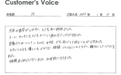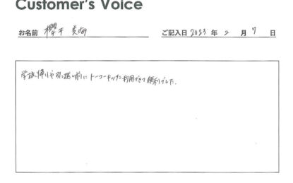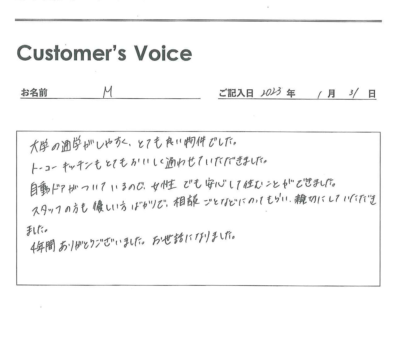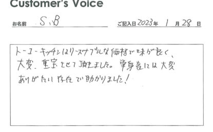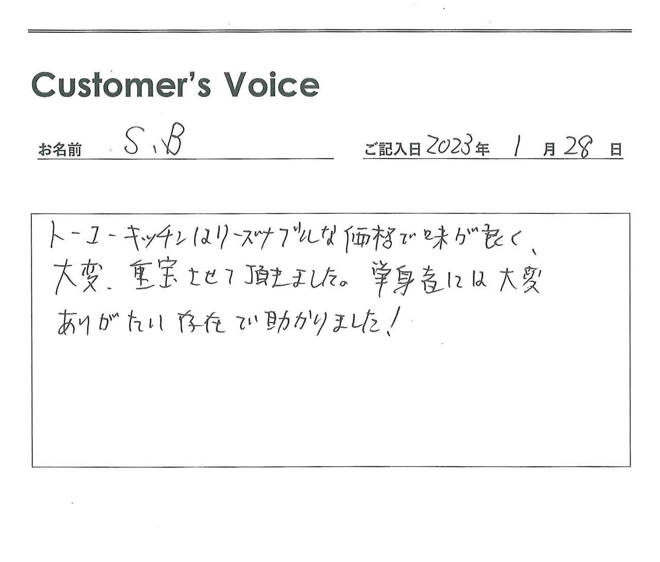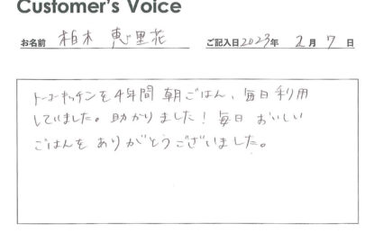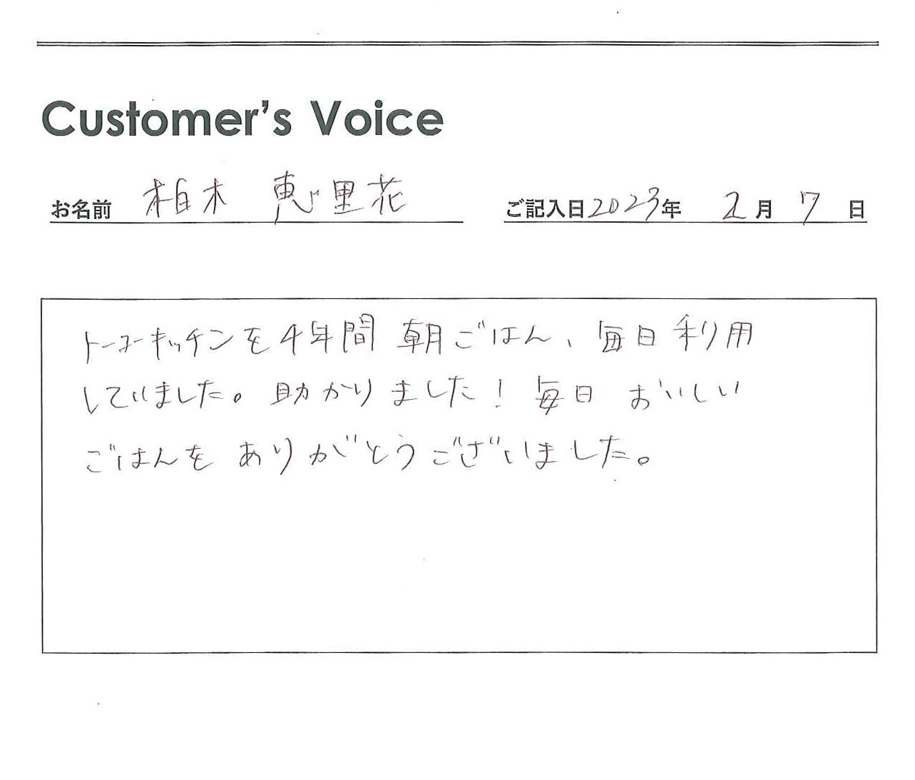◉こちらこそ、4年間トーコーキッチンを活用してくれてありがとう。トーコーキッチンを作ってよかったです。不動産屋冥利に尽きます。新生活でもしっかりごはん食べてね!(二代目より)