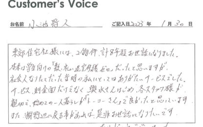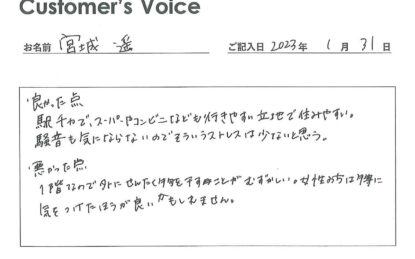 ◉Bさん、うれしいお言葉をありがとうございます。働き盛りの男性にそのように仰っていただけると喜びもひとしおで、不動産屋冥利に尽きます。励みにさせていただきます!(二代目より)