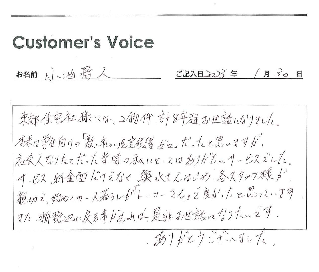 ◉こちらこそありがとうございました。「礼0・敷0・退室時修繕義務なし」は公平公正な契約を大事にしたまでです。「トーコーさんで良かった」のお言葉、励みになります!(二代目より)