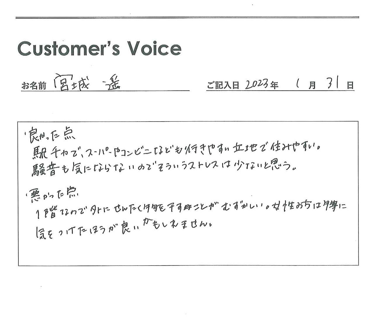 ◉貴重なご意見ありがとうございます。確かに、駅近なのに騒音が気にならないなど生活環境は抜群な反面、前面棟なく目の前が開けている分、1階は特別な注意も必要ですよね!(二代目より)