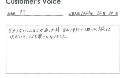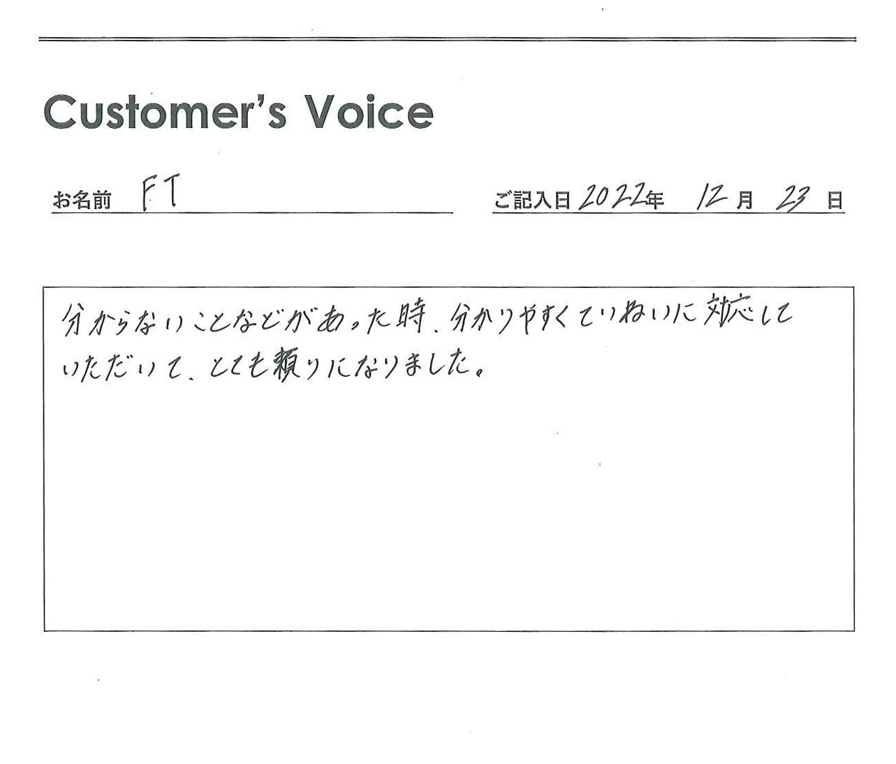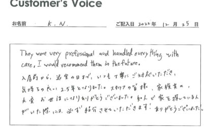 ◉この度はとってもキレイにお住まいいただきありがとうございました。立ち会わせていただいたスタッフが驚いていました。新天地での生活も素晴らしいものとなりますように!(二代目より)