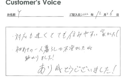 ◉当社管理物件内での住み替えをありがとう。また何か分からないことがあったり、手助けが必要になったりしたときには、いつでも遠慮なく教えてね。これからもよろしくね!(二代目より)