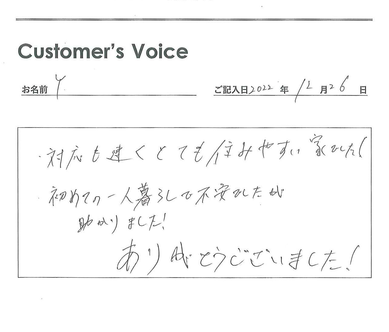 ◉こちらこそ、とってもキレイに住んでくれてありがとう。初めて一人暮らしは不安なことも色々あったと思うけど、ボクたちの存在が少しでも役に立ててたらうれしいです!(二代目より)