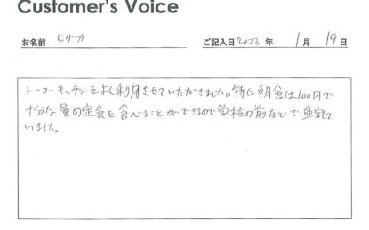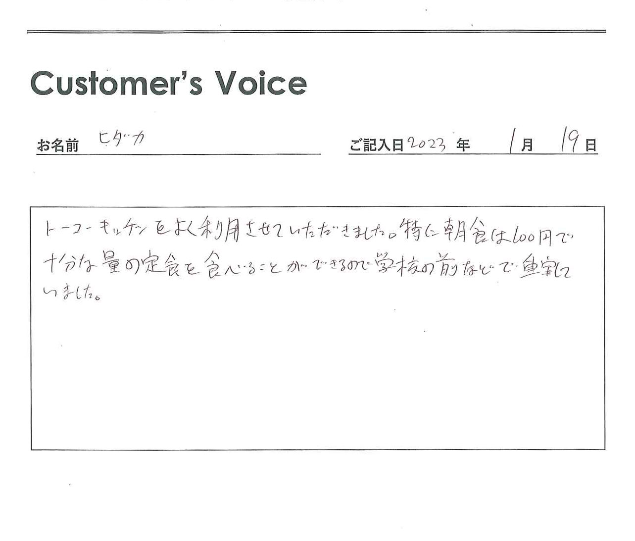 ◉この度は当社管理物件内での住み替えをありがとう。トーコーキッチンも引き続き使ってもらえるので、これからも100円朝食をしっかり食べて、大学生活を元気に送ってね!(二代目より)