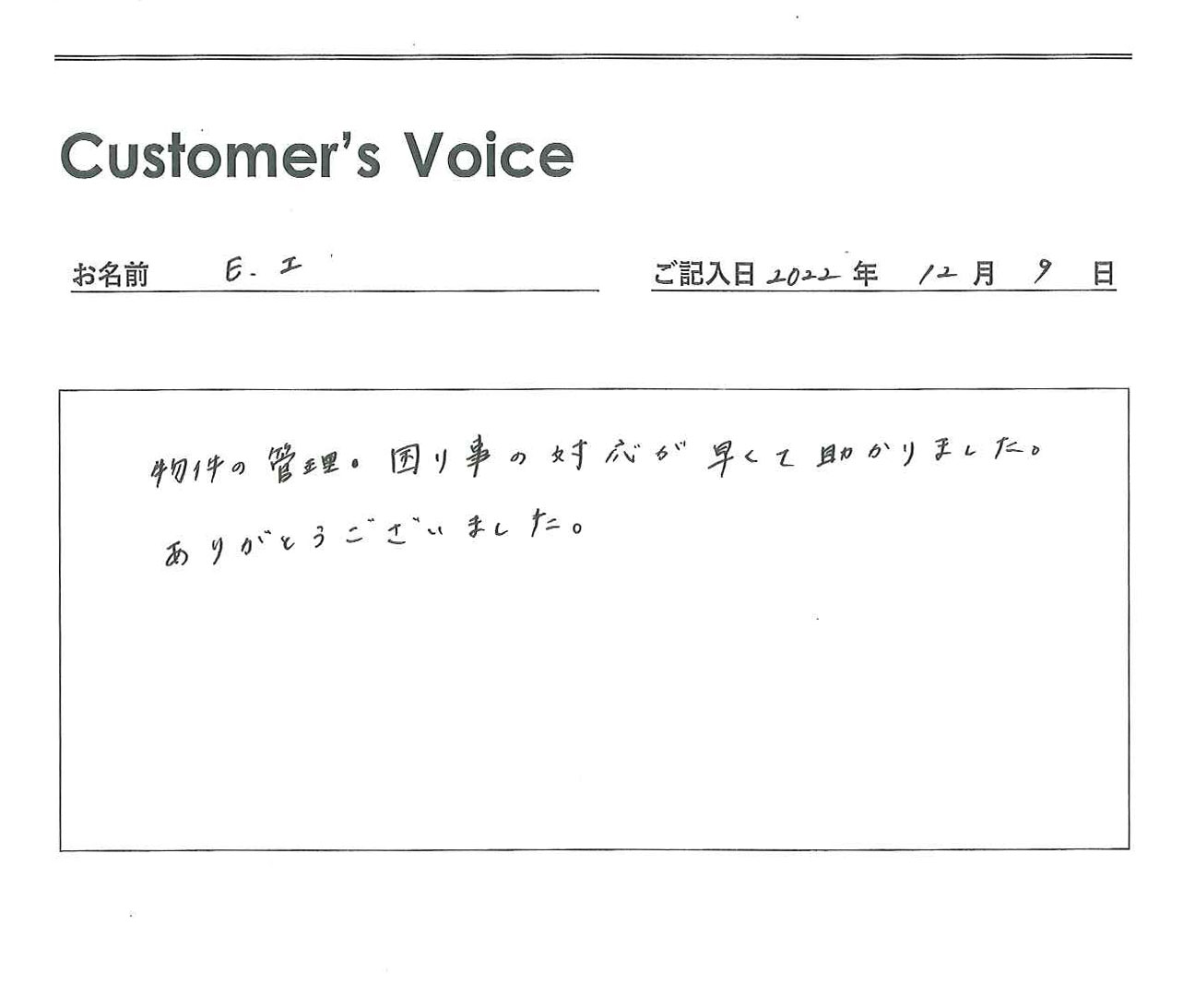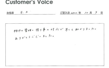 ◉Iさん、ありがとうございます。希望に見合う解決は即時実現を達成できないこともありますが、当社が実現できる「まず確認」「まず対応」を徹底するよう心掛けています!(二代目より)