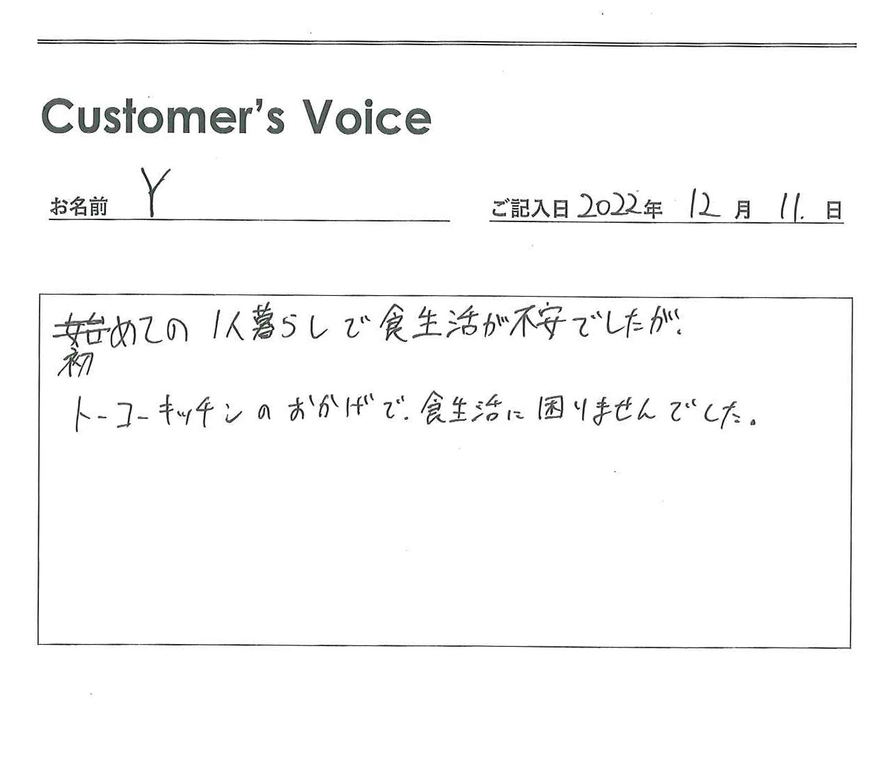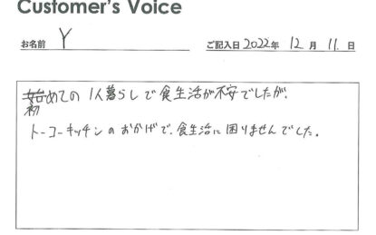 ◉Yくん、初めての一人暮らしとなると、やっぱり食事の心配ってあるよね。トーコーキッチンがYくんの淵野辺暮らしのお役に立てたようで良かったです。これからも頑張ってね!(二代目より)