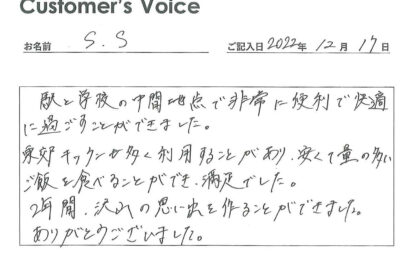 ◉Sくん、勉強おつかれさまでした。たくさんの思い出を作ってもらえて、トーコーキッチンも有効活用してもらえて、不動産屋としてこれ以上ない喜びです。新生活も楽しんで!(二代目より)