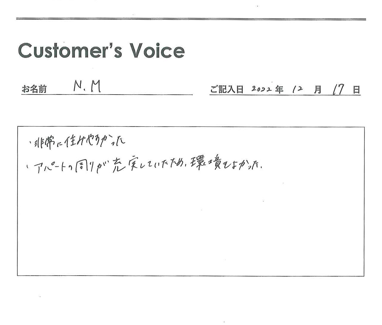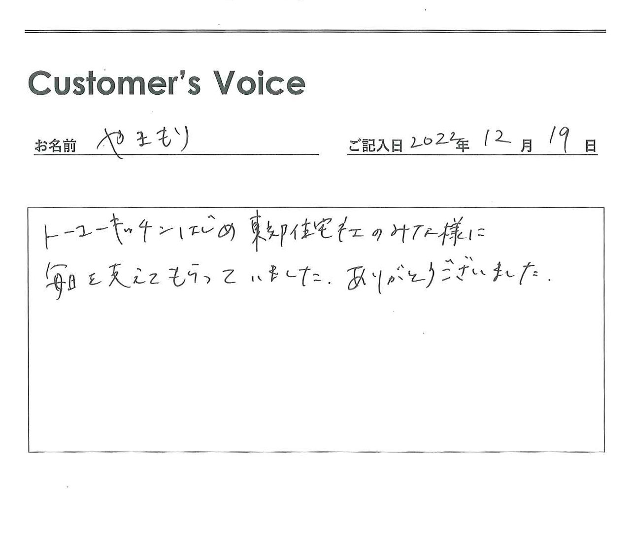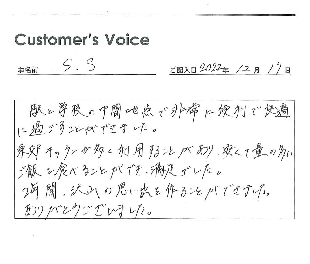 ◉こちらこそ、ご入居ありがとうございました。やまもりさんにいただいた言葉をスタッフ一同励みにさせてもらいます。うれしいお言葉をありがとう。そして、卒業おめでとう!(二代目より)