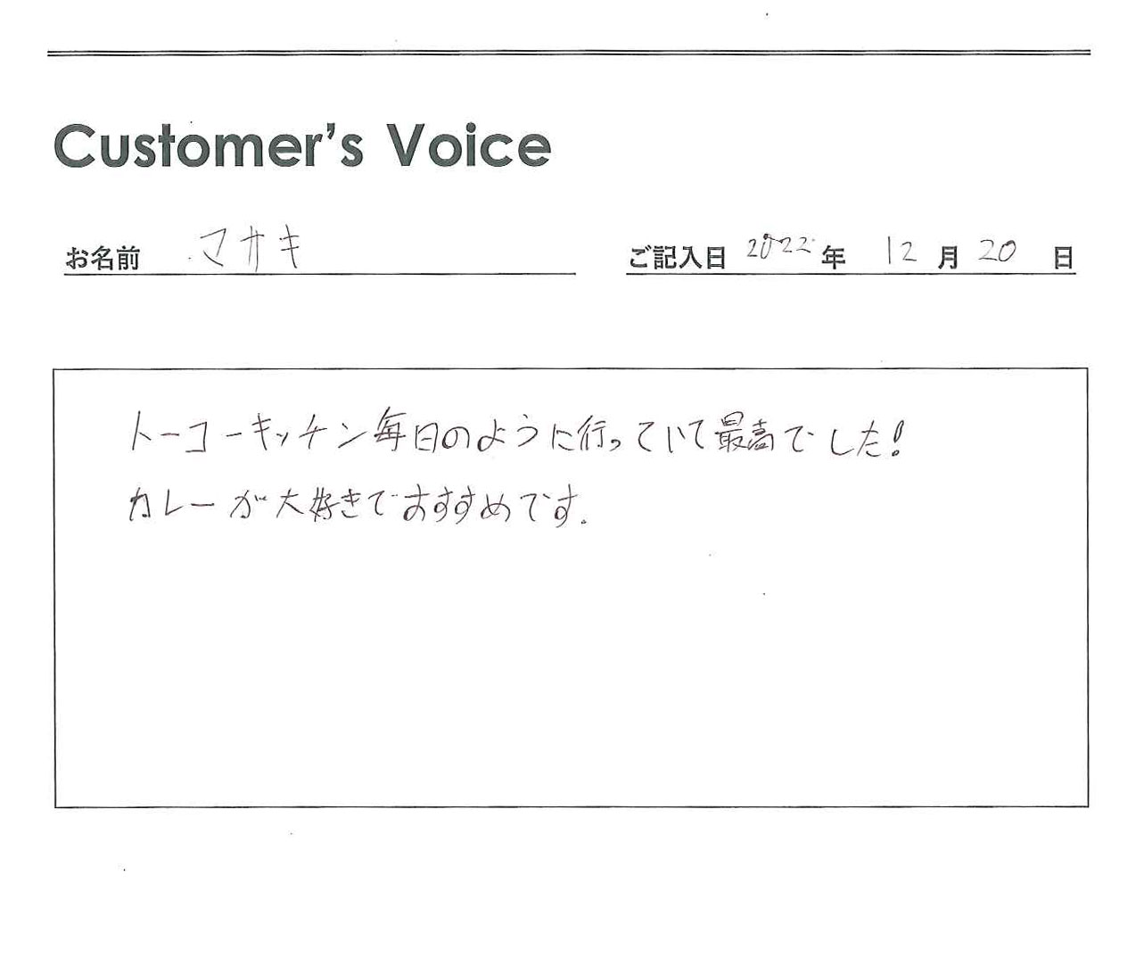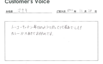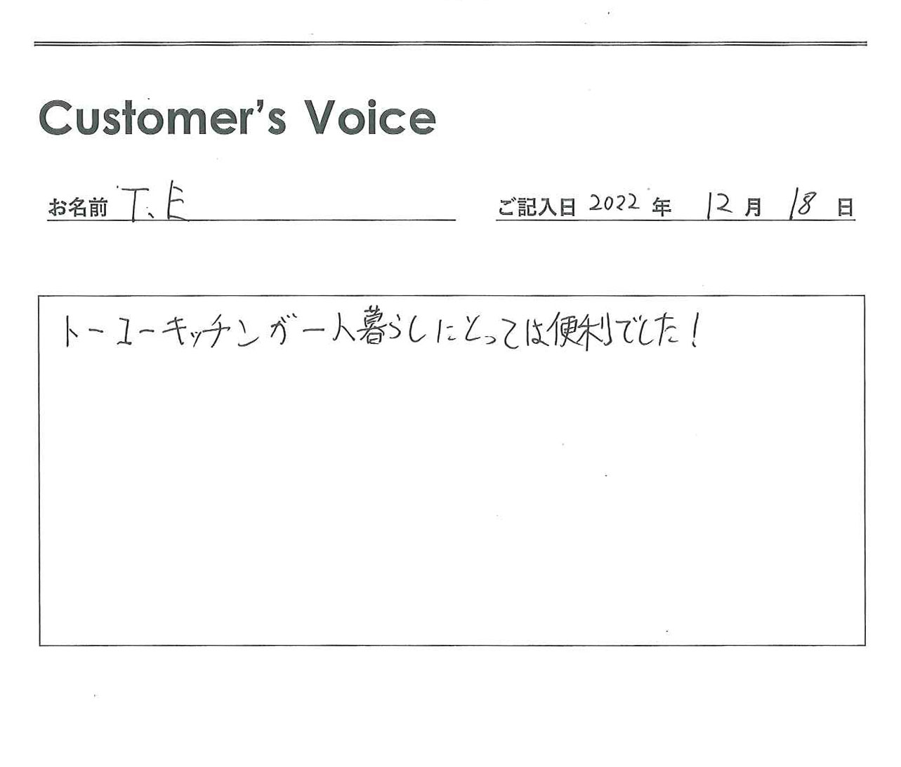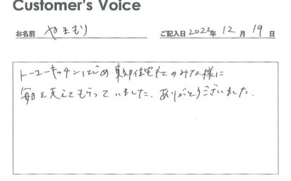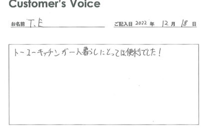 ◉Eくん、トーコーキッチンを便利に活用してくれてありがとう。トーコーキッチンを始めてよかったです。不動産屋冥利に尽きます。新生活でも食事に気を付けて頑張ってね!(二代目より)
