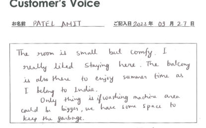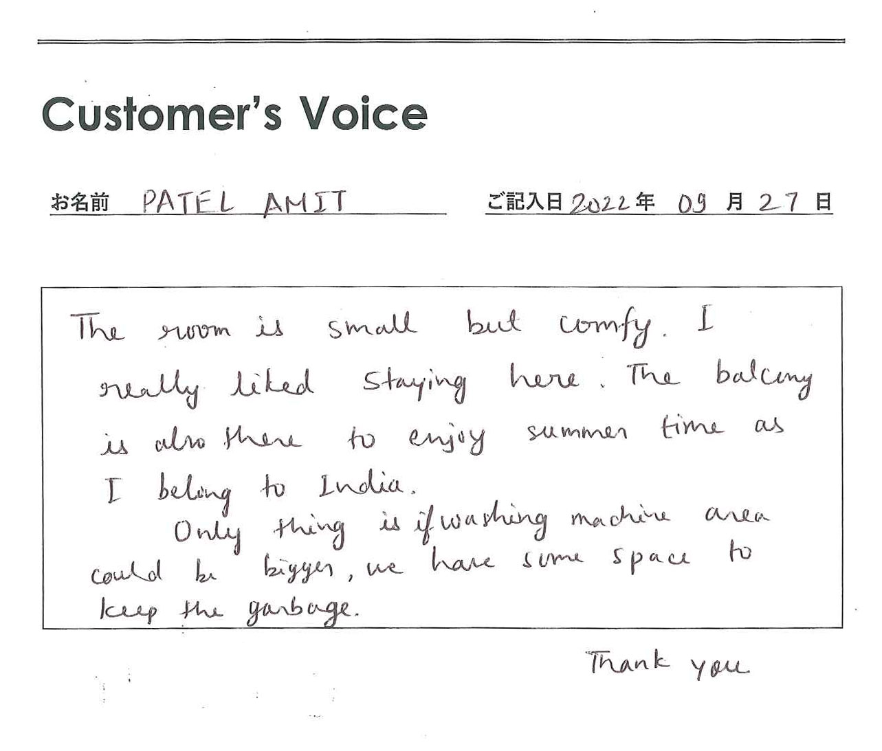 ◉Patelさん、うれしいコメントをありがとう。不慣れな土地での生活にも関わらず、お部屋での暮らしを満喫してくれたようで本当によかったです。インドに帰っても元気でね!(二代目より)