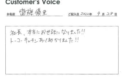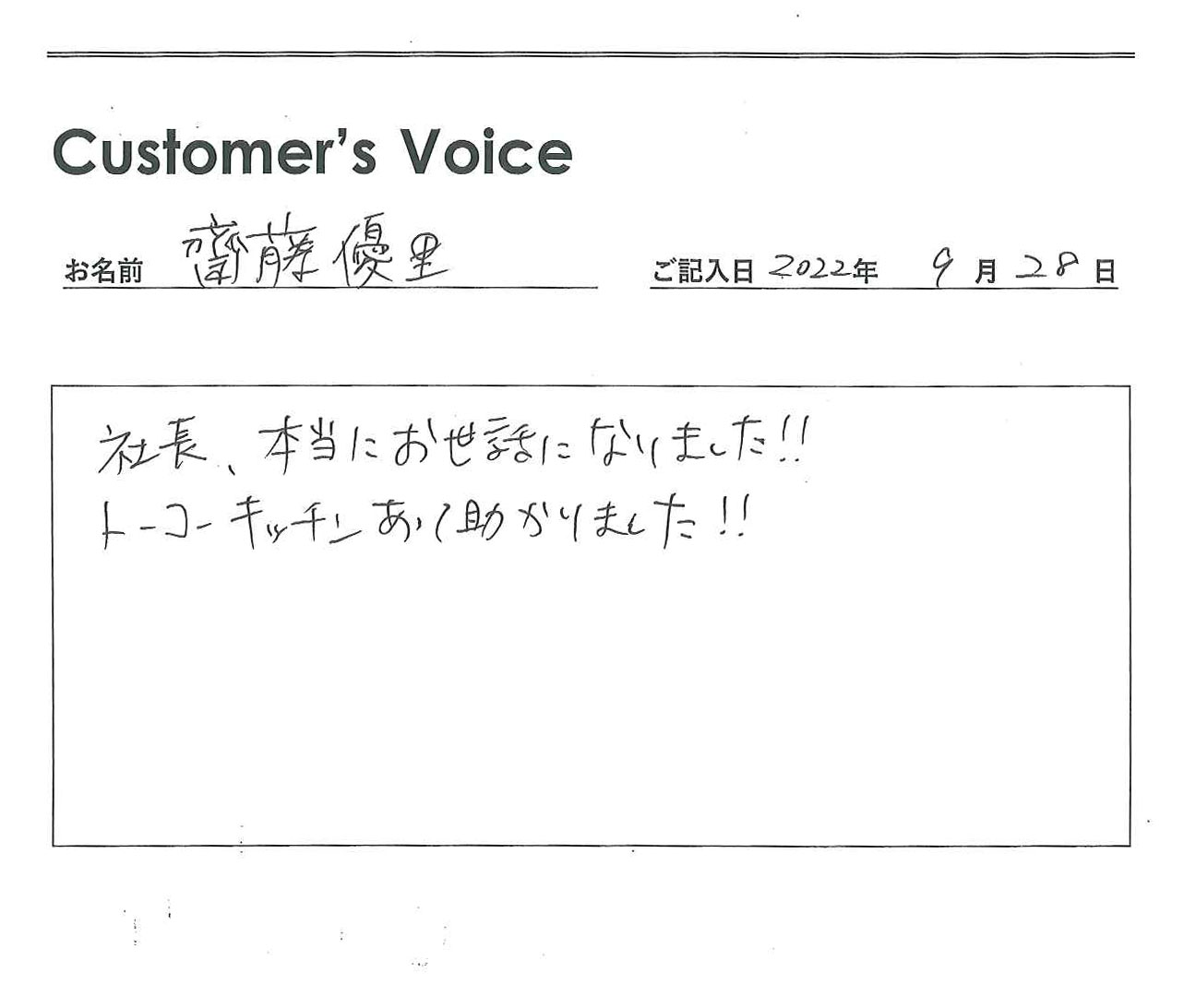 ◉齋藤さん、寂しくなります。こちらに戻ったときはトーコーキッチンや本社に必ず顔を出してくださいね。新たな門出、そして夢実現、心からおめでとうございます。お元気で!(二代目より)