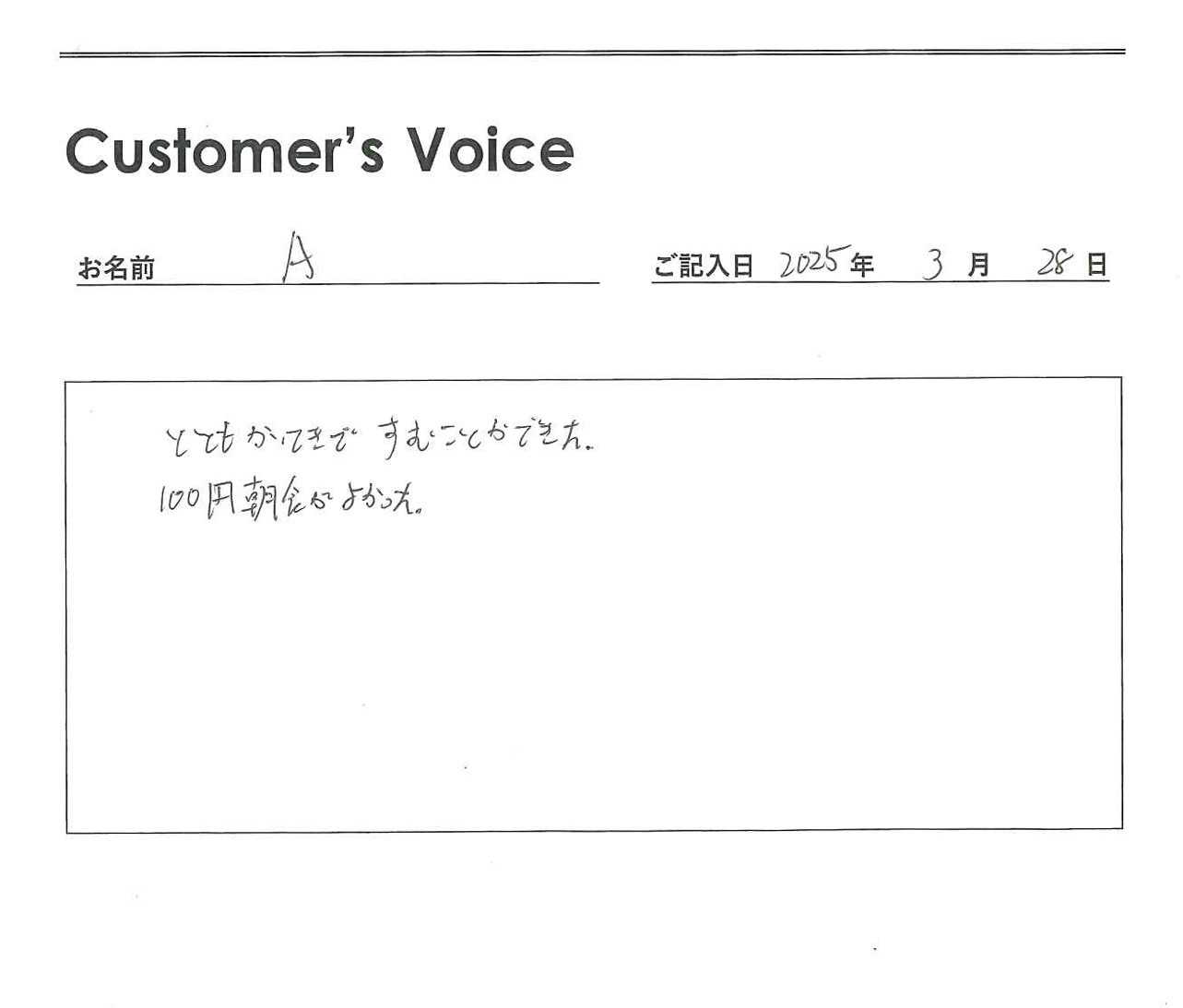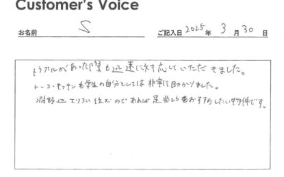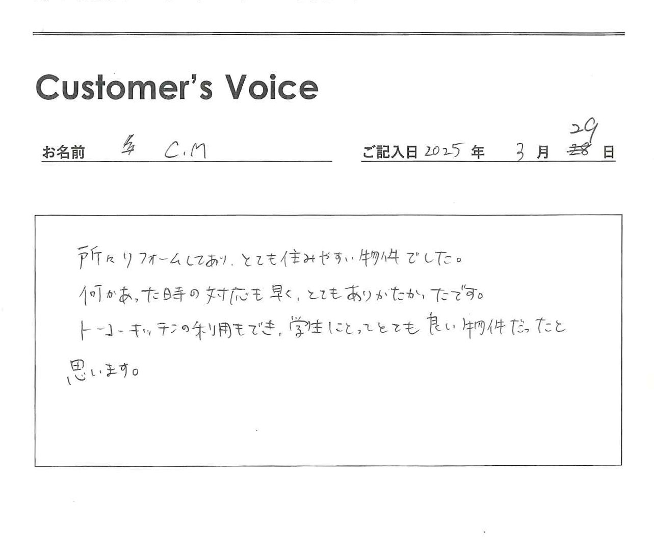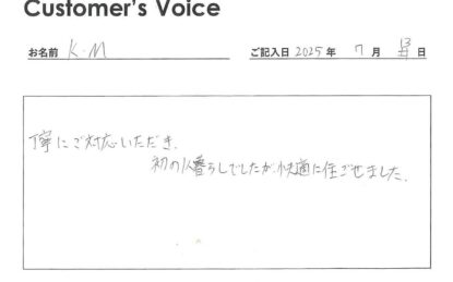◉Kさん、初めての一人暮らしを快適に過ごしていただけたとのことで本当によかったです。もしまたの機会がありましたら、お手伝いさせてください。ご連絡をお待ちしてます!(二代目より)