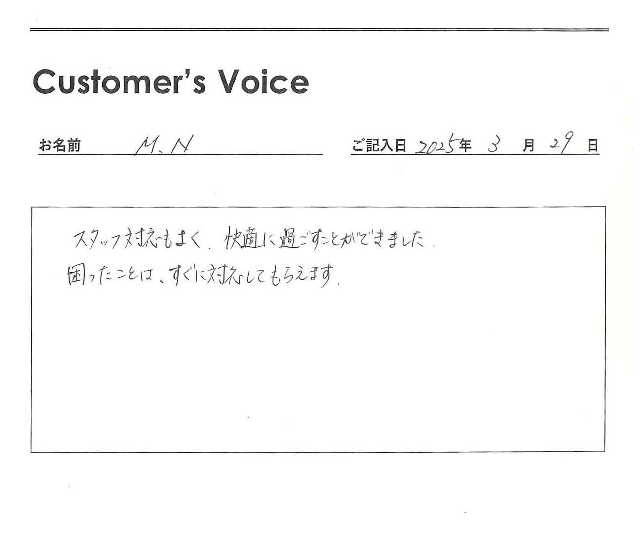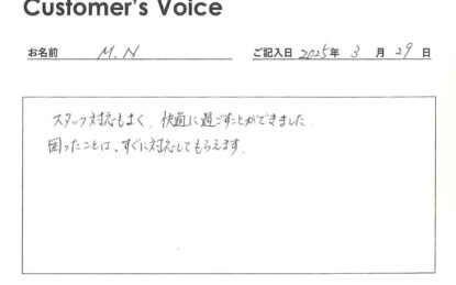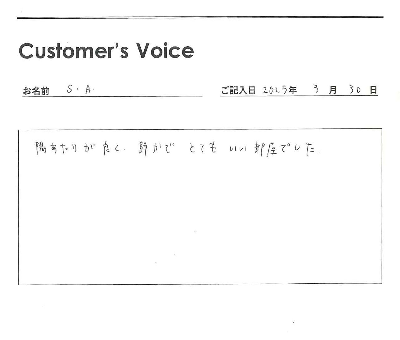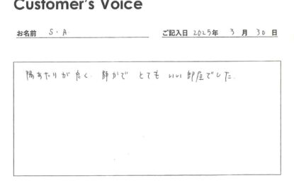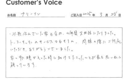 ◉隣人の騒音問題など、いろいろとご迷惑をおかけしたのにも関わらず、長期入居を続けてくれてありがとう。こっち方面に来ることがあったら、顔を見せに来てね。元気でね!(二代目より)
