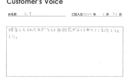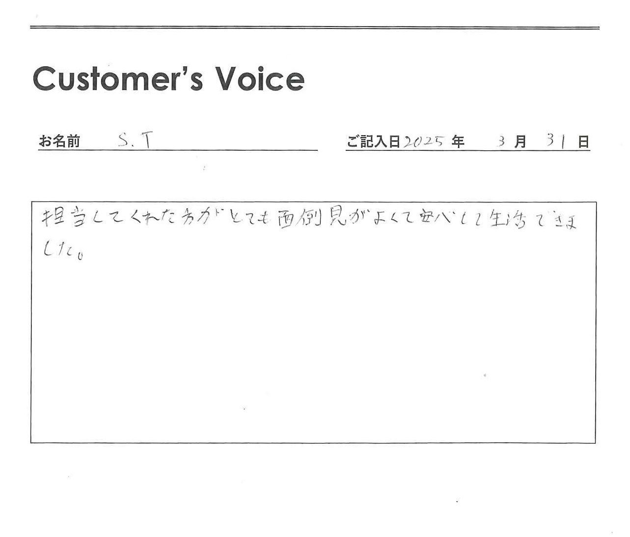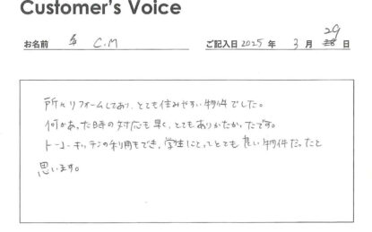 ◉Iさん、ありがとうございます。こちらこそ、大変お世話になりました。小さな不動産屋ですので、これからも入居者のみなさん一人ひとりに喜んでいただけるよう頑張ります!(二代目より)