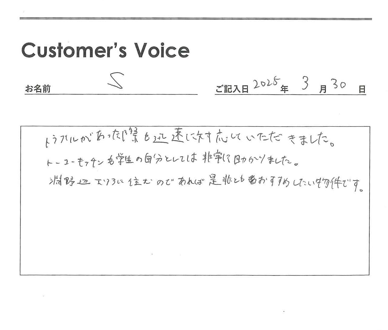 ◉リオさん、こちらこそ、東郊住宅社管理物件に入居してくれてありがとう。そして、とてもうれしいフィードバックをありがとう。オーナーさんにさっそく伝えさせてもらいます!(二代目より)