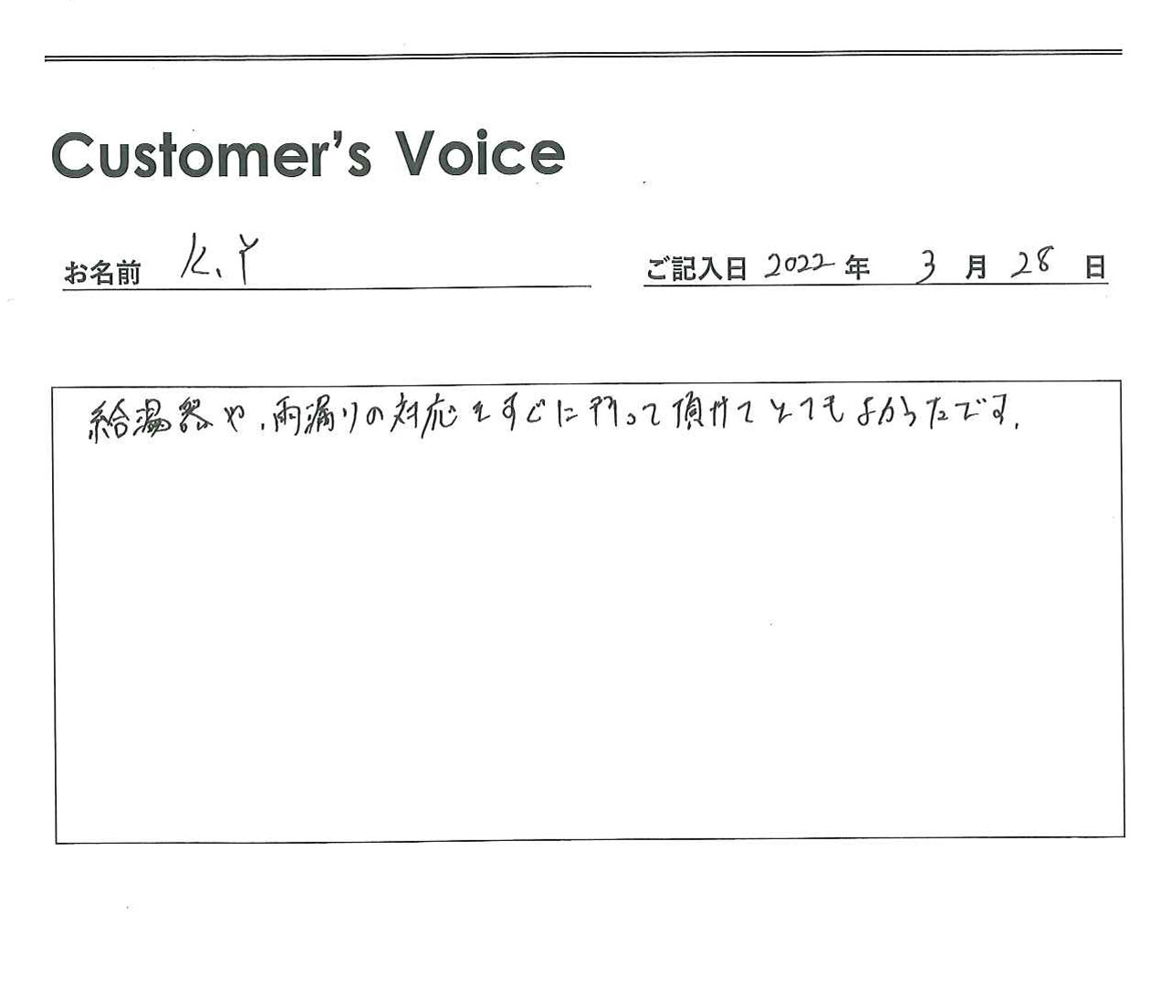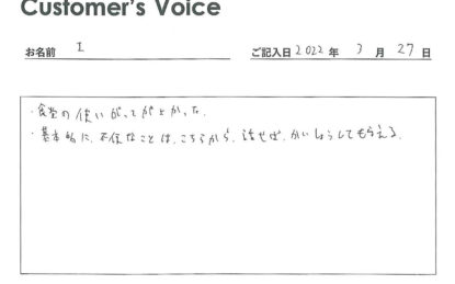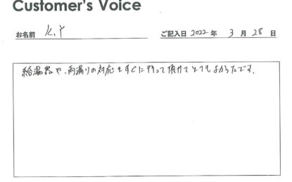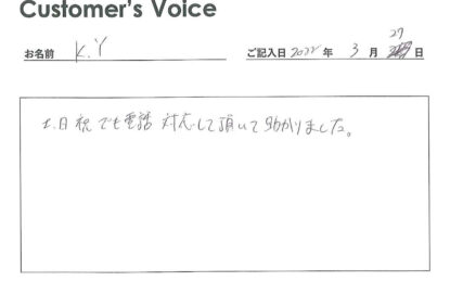 ◉Yさん、この度はご入居ありがとうございました。土・日・祝日はもちろん、当社は24時間365日年中無休、自社で緊急時対応です。助かったと仰ってもらえると励みになります!(二代目より)
