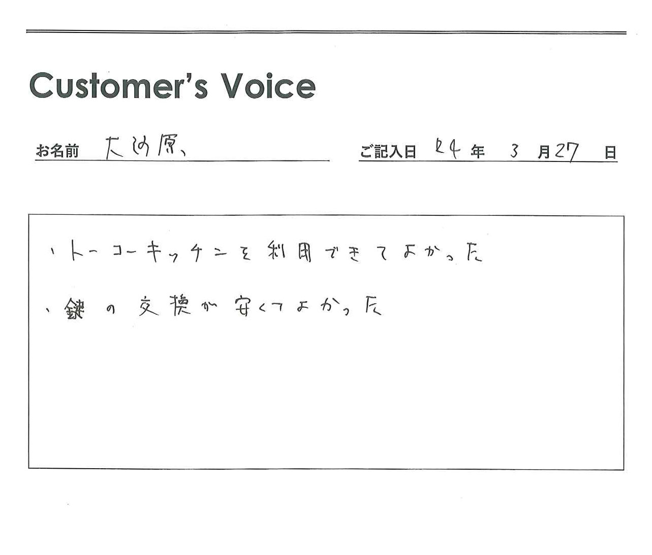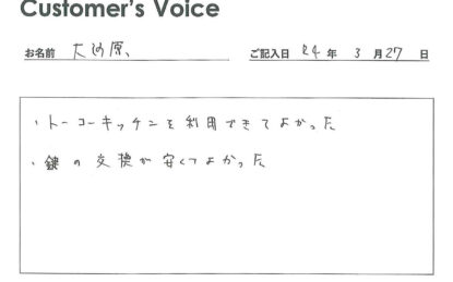 ◉大河原さん、トーコーキッチンを利用できてよかっただなんて、うれしいコメントをありがとう。これからも入居者のみなさんに喜んで便利に使ってもらえるように精進します!(二代目より)