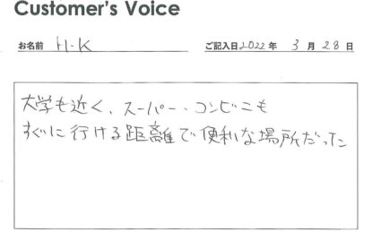 ◉生活に不便なく過ごせてもらえてよかった。ボクたちも「各種飲食店も含めて、なにげに生活便利な環境だよね」って、Kさんのコメントで改めてそう気付かせてもらいました!(二代目より)