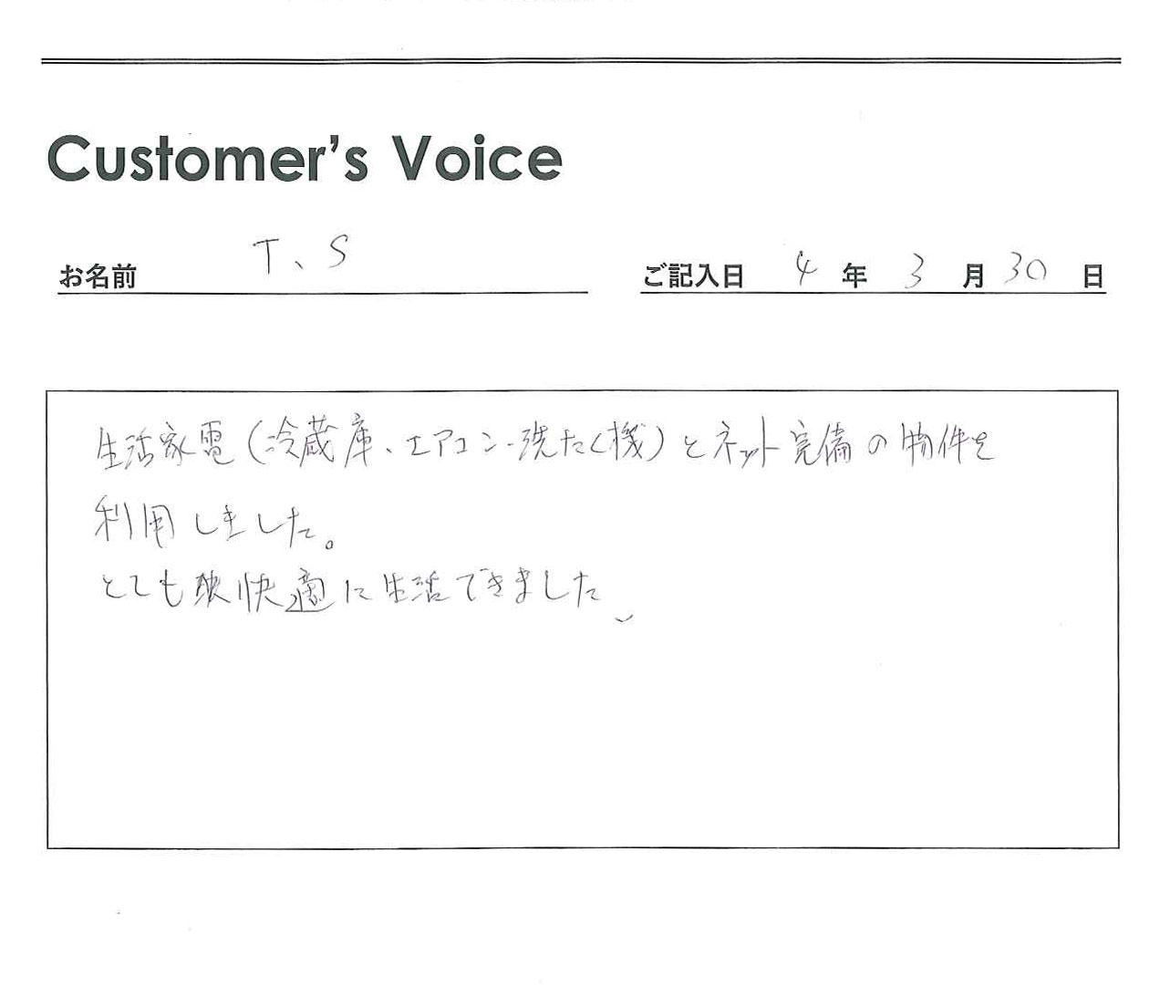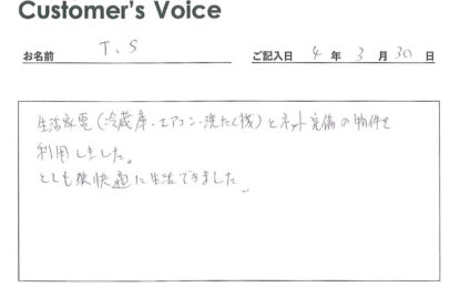 ◉快適に過ごしていただけてよかったです。生活家電が付いてネット無料の物件は本当に便利でありがたいですよね。オーナーさんにもSさんの声を伝えさせていただきます!(二代目より)