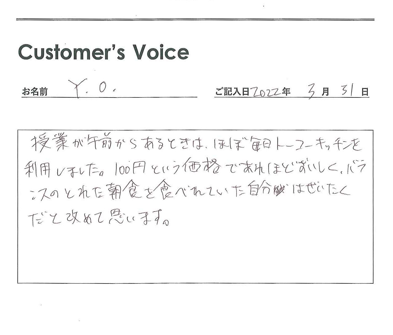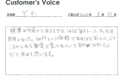 ◉Iくん、まずは卒業おめでとうだね。そして、トーコーキッチンの「使い勝手が良かった」というのはうれしい言葉です。こちら方面に来ることがあったら、ぜひ立ち寄ってね!(二代目より)